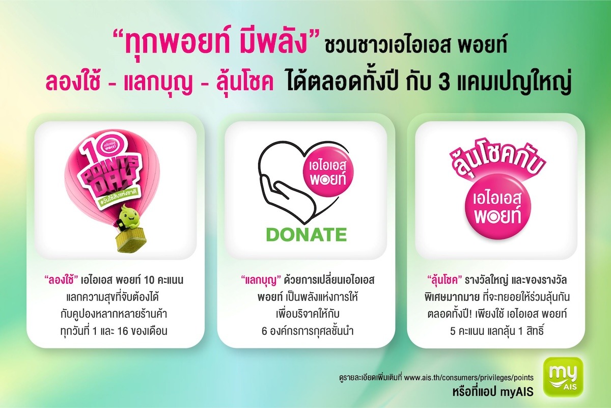 AIS เดินหน้ายกระดับประสบการณ์การดูแลลูกค้า ตอกย้ำความมุ่งมั่นในการสร้างมูลค่าเพิ่มให้แก่การใช้งานในทุกๆ วันของลูกค้าผ่าน “AIS Points” ภายใต้กลยุทธ์ “ทุกพอยท์ มีพลัง” มุ่งเปลี่ยนคะแนนสะสมทุกคะแนนให้เป็นมากกว่าสิทธิพิเศษทั่วไป สู่การเป็น “พลังที่ใช้ได้จริง” และ “พลังที่ส่งคืนให้สังคม” ด้วยการจัด 3 แคมเปญใหญ่ให้ลูกค้าได้สัมผัสประสบการณ์ ลองใช้ – แลกบุญ – ลุ้นโชค ที่ให้ลูกค้าได้รับความคุ้มค่าของการใช้คะแนนตลอดทั้งปี