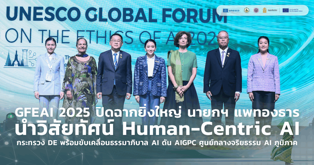 ประเทศไทยประสบความสำเร็จในการเป็นเจ้าภาพจัดการประชุมระดับโลก “The 3rd UNESCO Global Forum on the Ethics of AI 2025 (GFEAI 2025)” ระหว่างวันที่ 24–27 มิถุนายน 2568 ที่ผ่านมา ณ โรงแรมเซ็นทาราแกรนด์ เซ็นทรัลเวิลด์ กรุงเทพมหานคร โดยมีผู้นำ นักวิชาการ และผู้แทนจากกว่า 100 ประเทศทั่วโลก มากกว่า 1,000 คน ร่วมแลกเปลี่ยนมุมมองและออกแบบทิศทางการพัฒนา AI ที่มี “จริยธรรม โปร่งใส และยั่งยืน” พร้อมเปิดฉากเดินหน้าศูนย์ AI Governance Practice Center (AIGPC) ดันไทยสู่ศูนย์กลางจริยธรรม AI ระดับภูมิภาค ภายใต้การนำของนางสาวแพทองธาร ชินวัตร นายกรัฐมนตรี และประเสริฐ จันทรรวงทอง รองนายกรัฐมนตรีและรัฐมนตรีว่าการกระทรวงดิจิทัลเพื่อเศรษฐกิจและสังคม(ดีอี)