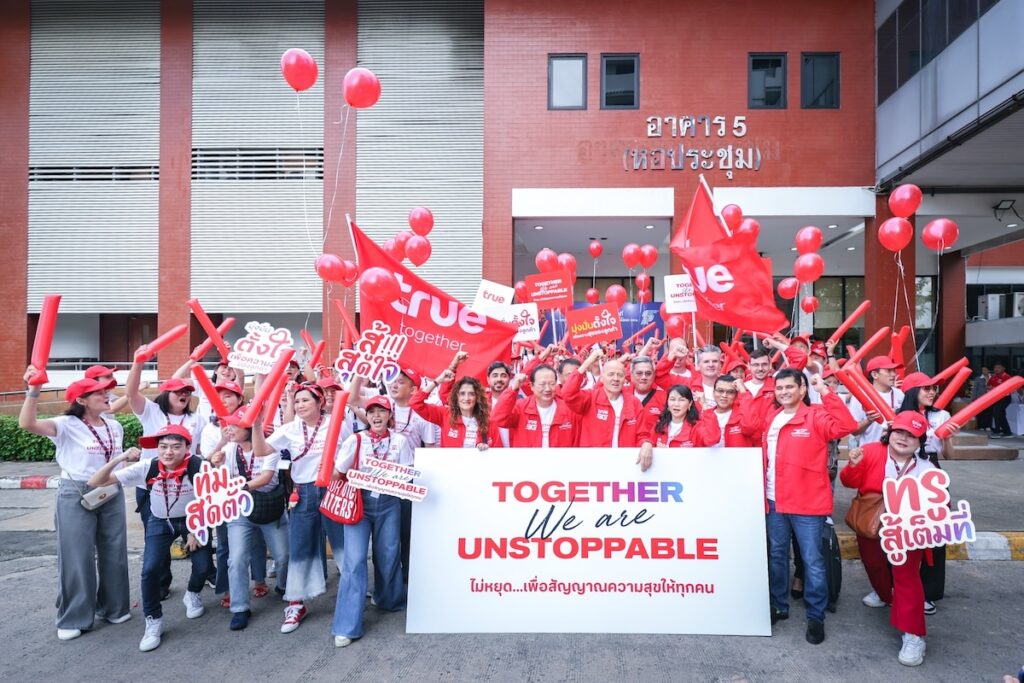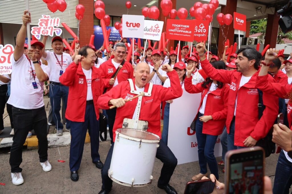 ขณะที่กองเชียร์พนักงานทรูจำนวนมากกว่า 100 คนรวมตัวส่งเสียงเชียร์ ให้กำลังใจผู้บริหารอย่างคับคั่ง สร้างความมั่นใจก่อนเข้าสู่การประมูลคลื่นความถี่ครั้งสำคัญเพื่อลูกค้าสะท้อนความมุ่งมั่นในการยกระดับคุณภาพโครงข่ายอย่างต่อเนื่องเพื่อให้บริการเพิ่มประสิทธิภาพยิ่งขึ้นทั่วประเทศ