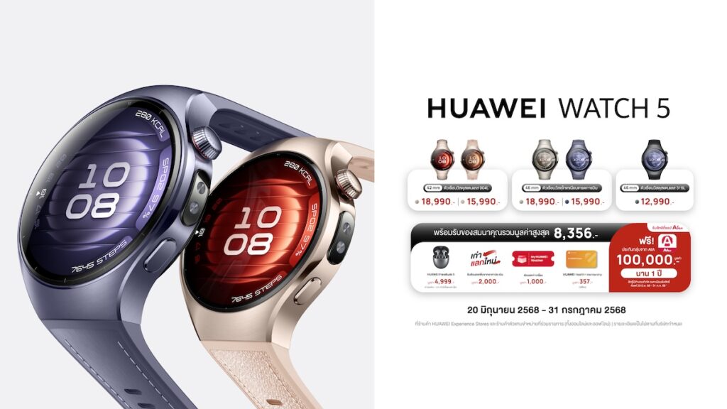 พร้อมข้อเสนอรับของสมนาคุณรวมมูลค่าสูงสุด 8,356 บาท ตั้งแต่วันนี้จนถึง 31 กรกฏาคม 2568 ประกอบด้วย HUAWEI FreeBuds 5 ราคา 4,999 บาท (จำกัดเพียง 1,000 คำสั่งซื้อแรกเท่านั้น) สิทธิ์เก่าแลกใหม่และรับส่วนลดเพิ่มจากราคาประเมินมูลค่า 2,000 บาท My HUAWEI Voucher ส่วนลดค่าเครื่อง มูลค่า 1,000 บาท และ HUAWEI Health+ Membership มูลค่า 357 บาท (3 เดือน) และสิทธิ์ที่แอป Alive ฟรี ประกันกลุ่มจาก AIA มูลค่า 100,000 บาท นาน 1 ปี สิทธิ์มีจำนวนจำกัด ลงทะเบียนรับสิทธิ์ตั้งแต่วันนี้ – 31 กรกฎาคม 2568