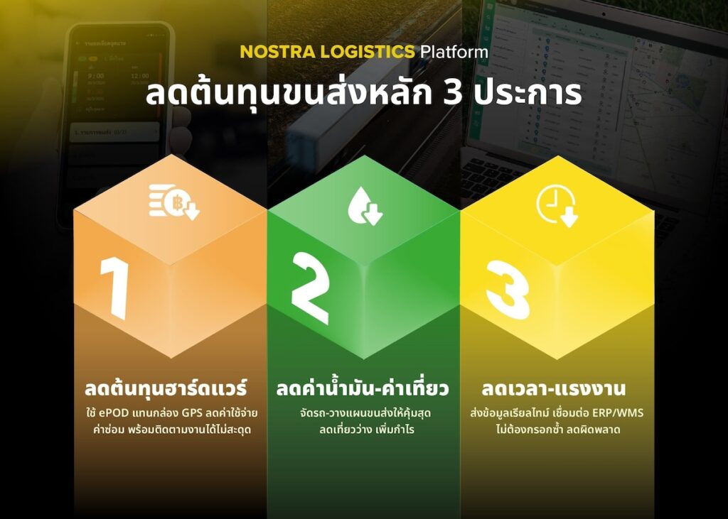ดังนั้น NOSTRA LOGISTICS TMS Platform ที่รวมเอาศักยภาพของ TMS (Transportation Management System) หรือระบบบริหารจัดการขนส่งอัจฉริยะ ผนวกกับความสามารถในการติดตามสถานะขนส่งแบบเรียลไทม์ของโมบายแอปพลิเคชัน ePOD (Electronic Proof of Delivery) เป็นโซลูชันสำคัญที่จะมาช่วยภาคธุรกิจพลิกเกมในครึ่งปีหลัง ยกระดับบริหารการขนส่ง ลดค่าใช้จ่ายกล่องจีพีเอส ควบคุมต้นทุน ลดรอบวิ่งรถซ้ำซ้อน วางแผนเส้นทางให้เหมาะสมรวมถึงรองรับการเชื่อมต่อข้อมูลแบบไร้รอยต่อ ไม่ว่าจะเป็น ERP หรือ WMS ให้เป็น IT Ecosystem พร้อมปรับแต่งให้สอดคล้องกับแต่ละธุรกิจ ครอบคลุมทั้งผู้ผลิตสินค้า (1PL) ผู้ให้บริการโลจิสติกส์แบบครบวงจร (3PL) และผู้รับจ้างขนส่ง (Subcontractor)