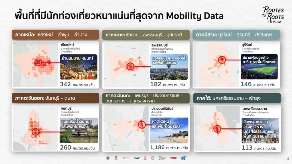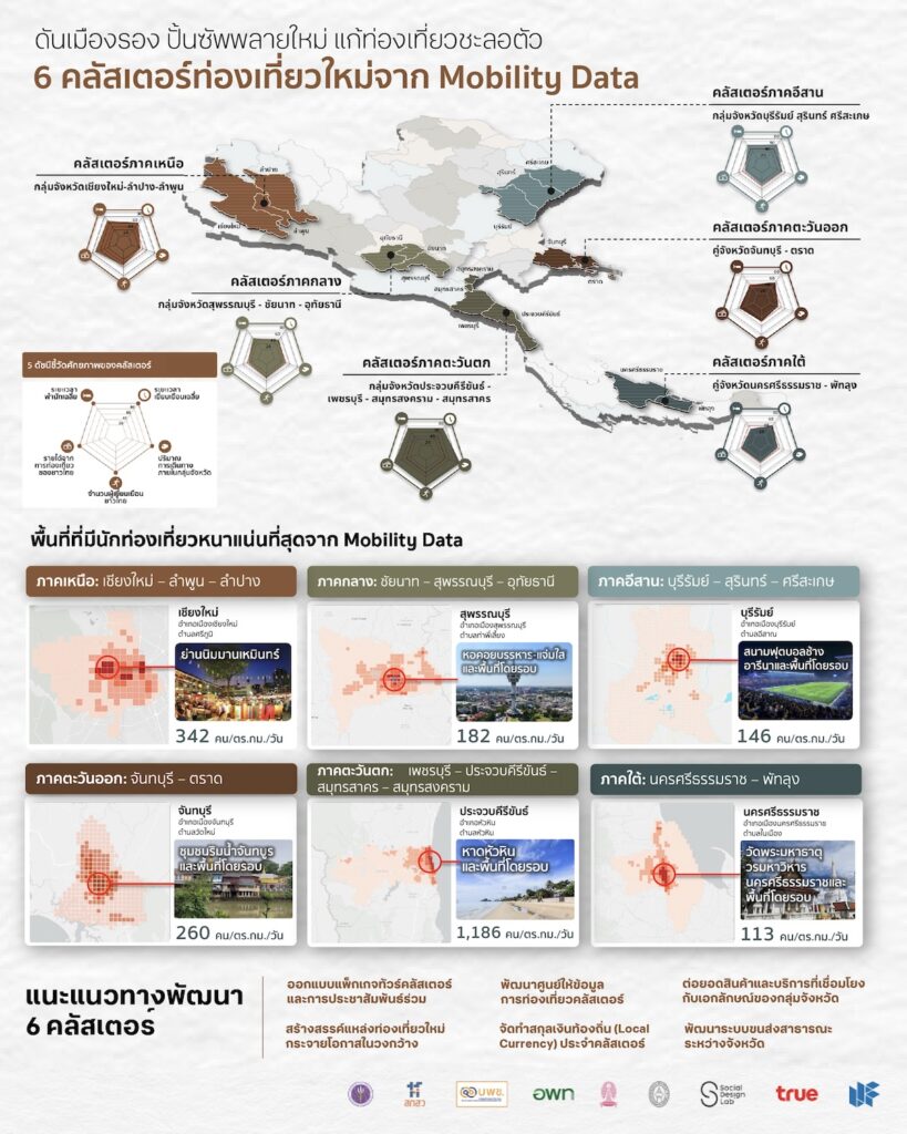 จากการวิเคราะห์เครือข่ายการเดินทางผ่าน mobility data พบว่าประเทศไทยมีเส้นทางศักยภาพถึง 21 เส้นทางที่สามารถพัฒนาสู่การท่องเที่ยวแบบคลัสเตอร์ ตัวอย่างเช่น เชียงใหม่-ลำปาง-ลำพูน, นครปฐม-ราชบุรี-กาญจนบุรี, เพชรบุรี-ประจวบคีรีขันธ์-สมุทรสาคร-สมุทรสงคราม, ขอนแก่น-ชัยภูมิ เป็นต้น ทั้งนี้ กลุ่มคลัสเตอร์จะมีศักยภาพในการพัฒนาสู่เส้นทางท่องเที่ยวได้นั้น จะต้องมีองค์ประกอบสำคัญ 5 ข้อ ได้แก่