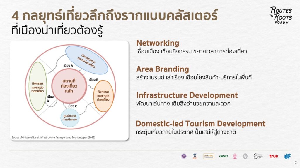 “กลยุทธ์การท่องเที่ยวแบบคลัสเตอร์นี้ ช่วยให้ผู้มีส่วนเกี่ยวข้องกับอุตสาหกรรมท่องเที่ยวไทยทั้งนักนโยบาย นักการตลาด นักธุรกิจ นักลงทุน ผู้ประกอบการรายย่อย เห็นภาพอุตสาหกรรมด้วยมุมมองใหม่ๆ เห็นโอกาสใหม่ๆ กลุ่มเป้าหมายใหม่ๆ รูปแบบการเดินทางใหม่ๆ ที่จะช่วยพัฒนาอุตสาหกรรมให้เติบโตโดยอยู่บนพื้นฐานแห่งความยั่งยืน โดยเฉพาะในยุคที่คุณค่า ความหมาย และประสบการณ์ที่แท้จริง คือ ความต้องการของนักท่องเที่ยวในปัจจุบัน” ผศ.ดร.ณัฐพงศ์ กล่าว อ่านรายละเอียดคลัสเตอร์เพิ่มเติมได้ที่ https://true.th/blog/routes-to-roots-cluster/