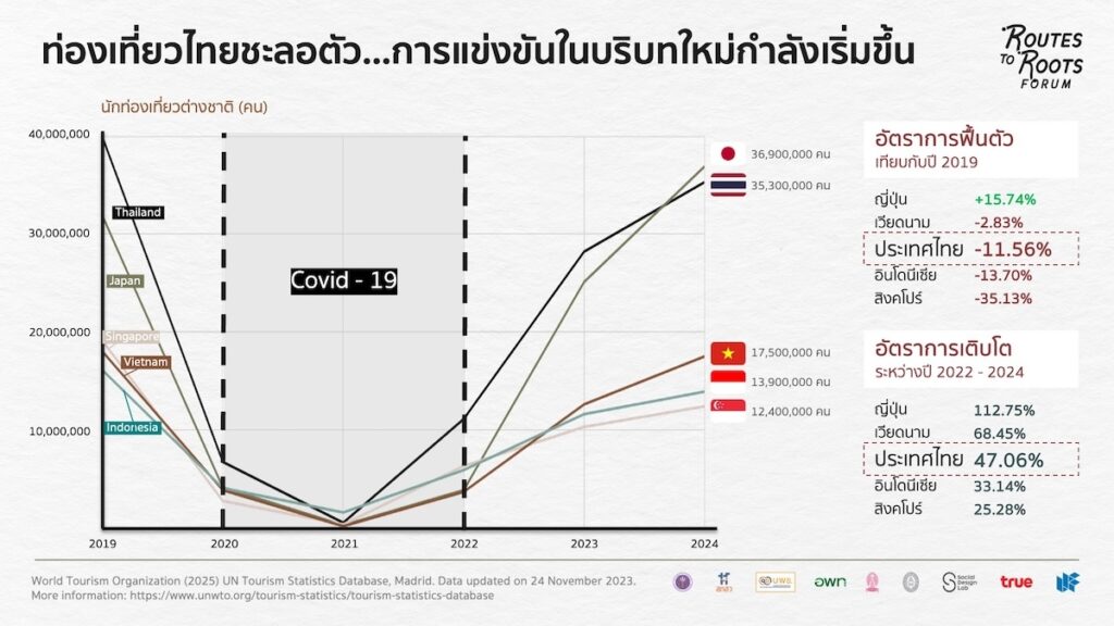 อุตสาหกรรมการท่องเที่ยวถือเป็น “เครื่องยนต์ทางเศรษฐกิจ” ที่สำคัญของไทย ซึ่งในปี 2562 จำนวนนักท่องเที่ยวต่างชาติในไทยพุ่งทะยานถึงระดับเกือบ 40 ล้านคนต่อปี สร้างรายได้ให้กับประเทศถึงราว 19% รั้งอันดับ 4 ของโลกที่มูลค่า 60.5 พันล้านบาท จนเผชิญกับวิกฤตโควิด-19 ภูมิทัศน์ทางการแข่งขันในอุตสาหกรรมท่องเที่ยวโลกได้เปลี่ยนแปลงไป โดยเฉพาะภูมิภาคเอเชียแปซิฟิก นำโดยญี่ปุ่น ซึ่งมีอัตราการเติบโตกว่าเท่าตัวที่ 112% ตามด้วยเวียดนามที่ 68% และไทย 47% และเมื่อเทียบกับยุคก่อนโควิด-19 อัตราการฟื้นตัวของไทยยังคงติดลบ 12% ทำให้สัดส่วนรายได้ต่อจีดีพีลดลงมาที่ 14% โดยมีปัจจัยลบจากการชะลอตัวของเศรษฐกิจโลก และปัญหาความตึงเครียดทางภูมิรัฐศาสตร์