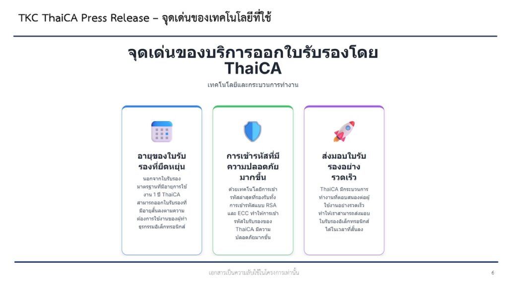 เมื่อวันที่ 29 กรกฎาคม 2568 บริษัท เทิร์นคีย์ คอมมูนิเคชั่น เซอร์วิส จำกัด (มหาชน)หรือ TKC เปิดตัวบริการใหม่ภายใต้ชื่อ “ThaiCA” ซึ่งเป็นบริการที่ส่งเสริมโครงสร้างพื้นฐานด้านความมั่นคงปลอดภัยและความเชื่อมั่นในการทำธุรกรรมอิเล็กทรอนิกส์ของประเทศไทย เป็นการตอบโจทย์การใช้งานทั้งในภาครัฐ ภาคเอกชน และประชาชนทั่วไปในยุคเศรษฐกิจดิจิทัล