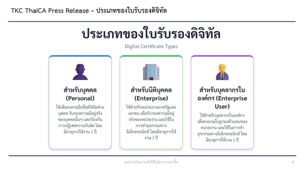1.ใบรับรองสำหรับบุคคล(Personal Certificate)เพื่อเสริมสร้างศักยภาพให้บุคคลมีตัวตนดิจิทัลที่ปลอดภัยและตรวจสอบได้