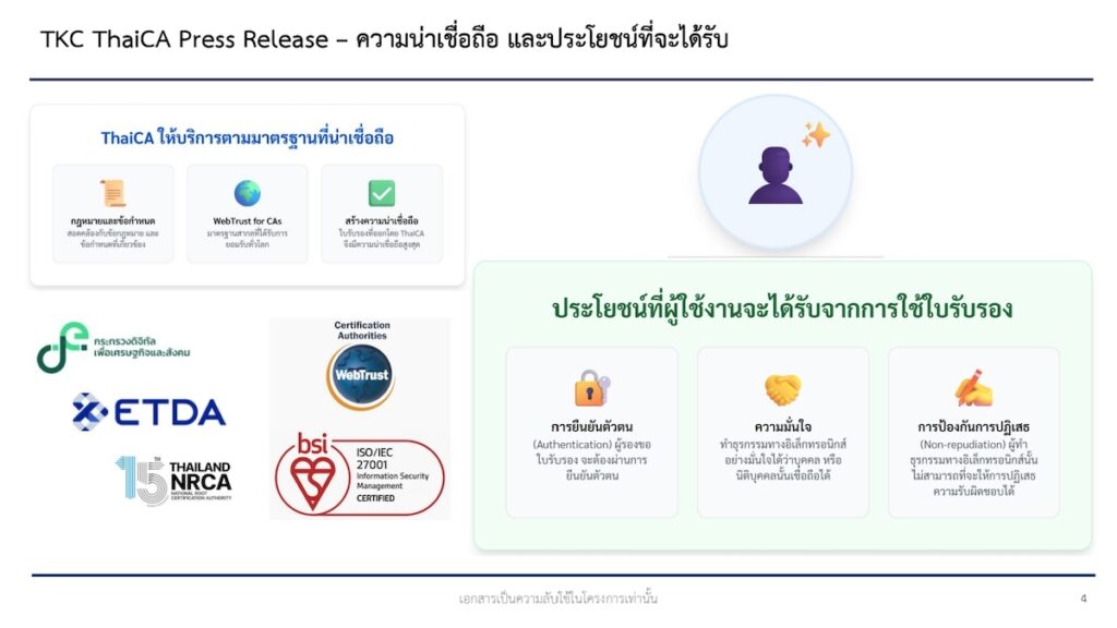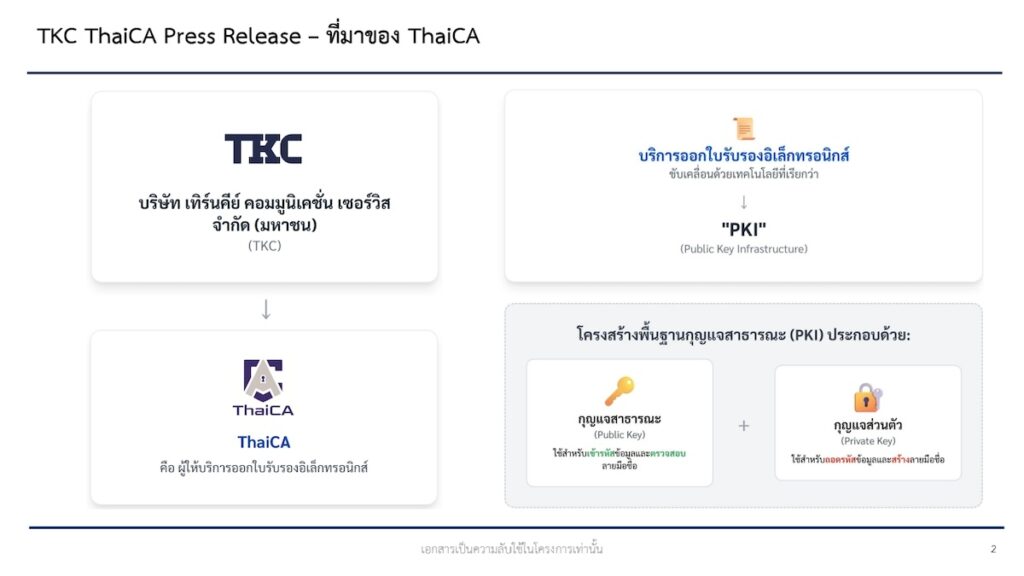 TKC ประกาศเปิดตัว “ThaiCA” ให้บริการ “ใบรับรองดิจิทัล” ในกลุ่มลงนามเอกสารเจ้าแรกในไทย มุ่งตอบโจทย์การทำธุรกรรมอิเล็กทรอนิกส์ทั้งภาครัฐ ภาคเอกชนยกระดับความมั่นคงปลอดภัยสู่มาตรฐานสากล เผยความต้องการมากกว่า 4 ล้านคน ตั้งเป้าส่วนแบ่งมาร์เก็ตแชร์ปีแรก 30% จากขนาดตลาดปี 67 ที่ 140 ล้านบาทและคาดอีก 3 ปีขนาดตลาดโตถึง 500 ล้านบาท