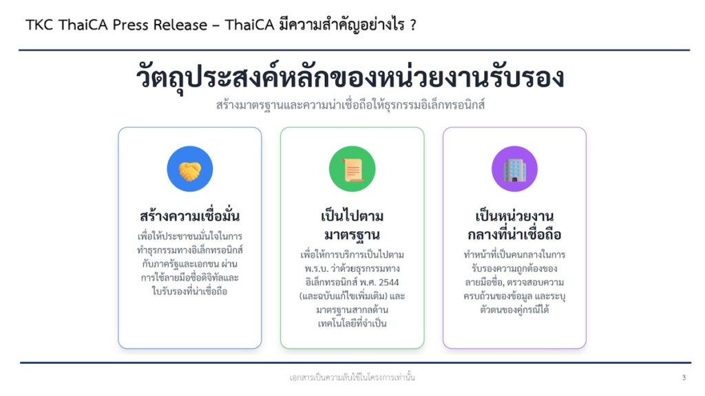 การออกใบรับรองของ ThaiCA สอดคล้องกับพระราชบัญญัติว่าด้วยธุรกรรมทางอิเล็กทรอนิกส์ของประเทศไทยและมาตรฐานเทคโนโลยีสากล เพื่อให้เกิดความมั่นใจว่าการเซ็นใบรับรองทางดิจิทัล มีความปลอดภัยสูง และมีผลผูกผันทางกฎหมาย ไม่สามารถปฏิเสธความรับผิดชอบได้