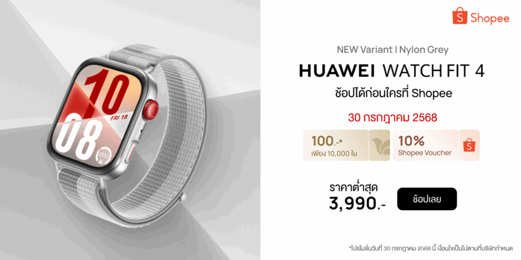 HUAWEI WATCH FIT 4 สีเทาใหม่ พร้อมมอบประสบการณ์การใช้งานสมาร์ทวอทช์ที่เหนือกว่า ทั้งดีไซน์ ฟีเจอร์ และความคุ้มค่า วางจำหน่ายเอ็กซ์ถคลูซีฟเฉพาะที่ Shopee เพียง 3,990 บาท จากปกติ 4,990 บาท รับฟรีทันที! สิทธิ์ใช้งาน HUAWEI Health+ ฟรี 3 เดือน มูลค่า 357 บาท เมื่อสั่งซื้อตั้งแต่วันที่ 30 กรกฎาคม 2568 – 6 สิงหาคม 2568