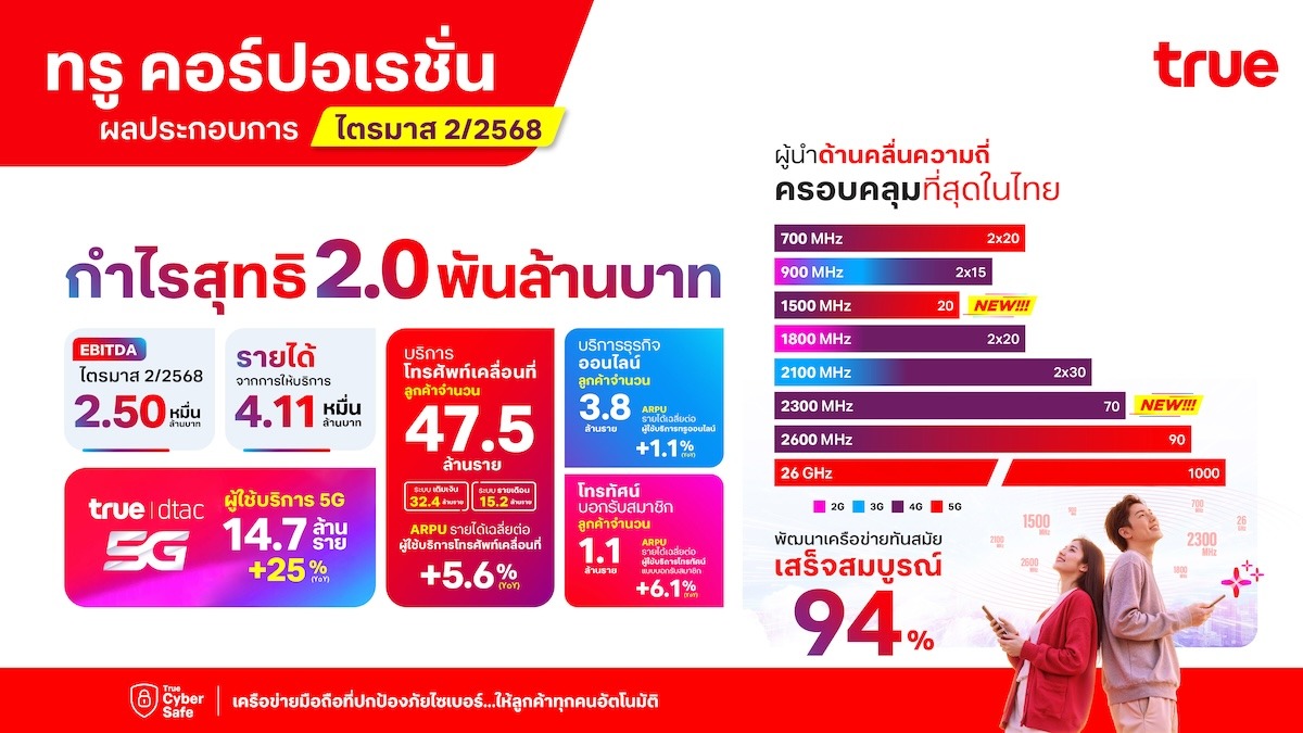 สำหรับไตรมาส 2/2568 ทรู รายงานกำไรสุทธิหลังหักภาษี 2.0 พันล้านบาท ทรู บันทึกผลกระทบเชิงลบที่เกิดขึ้นเพียงครั้งเดียว (one-time costs) จำนวน 2.5 พันล้านบาทที่เกี่ยวข้องกับการด้อยค่าสินทรัพย์จากการดำเนินการพัฒนาโครงข่ายให้ทันสมัย และการยุติบริการคลื่น 850 MHz เมื่อปรับปรุงผลกระทบจากรายการครั้งเดียวและผลประโยชน์ทางภาษีในไตรมาส 2/2568 จำนวน 368 ล้านบาท กำไรสุทธิหลังหักภาษีมีจำนวน 4.2 พันล้านบาท ค่าใช้จ่ายด้านการลงทุน (CAPEX) สำหรับไตรมาส 2/2568 อยู่ที่ 7.2 พันล้านบาท ประมาณครึ่งหนึ่งเป็นต้นทุนการบูรณาการที่เกี่ยวข้องกับการดำเนินการพัฒนาโครงข่ายให้ทันสมัย