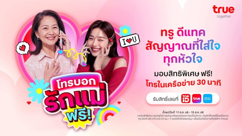 เนื่องในโอกาสวันแม่แห่งชาติปีนี้ ทรูดีแทคขอร่วมเป็นส่วนหนึ่งในการส่งต่อความรักจากหัวใจลูกถึงหัวใจแม่ ภายใต้แนวคิด “มัมคือที่หนึ่ง…ทรูดีแทค สัญญาณที่ใส่ใจทุกหัวใจ รักแม่ทุกโมเมนต์” พร้อมมอบสิทธิพิเศษมากมายให้ลูกค้าได้บอกรักแม่แบบจัดเต็มตลอดเดือนสิงหาคมนี้ โทรฟรี! บอกรักแม่ ให้หายคิดถึง ในเครือข่ายทรูและดีแทคฟรี 30 นาที นาน 24 ชม. เพียงกดรับสิทธิ์ผ่าน True ID App ,True App หรือ dtac app. 1 เบอร์/ 1 สิทธิ์/ แคมเปญ ใช้ได้ระหว่างวันที่ 11–15 สิงหาคม 2568 ทั้งลูกค้ารายเดือน และเติมเงิน