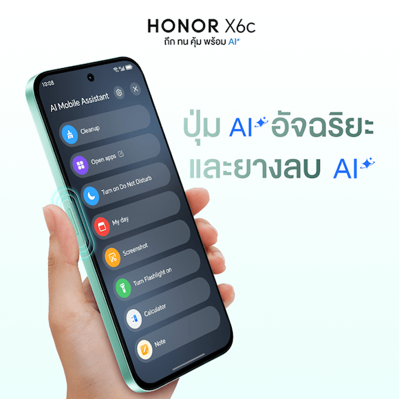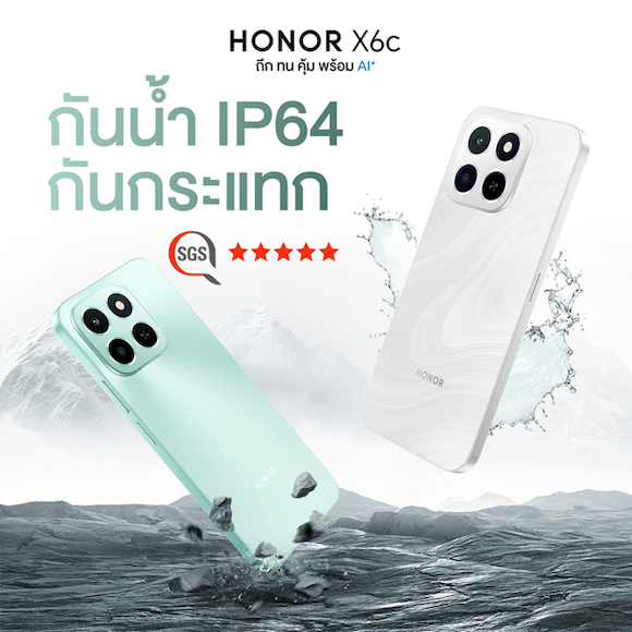 ออเนอร์ (HONOR)เปิดตัว HONOR X6c สมาร์ทโฟนรุ่นเล็กใหม่ล่าสุด ที่ยกระดับสมาร์ทโฟนระดับเริ่มต้นด้วยเทคโนโลยี AI สุดล้ำมอบประสิทธิภาพเหนือระดับในราคาคุ้มค่า โดดเด่นด้วยความทนทาน กันน้ำและกันกระแทกระดับ 5 ดาวรองรับการตกจากที่สูงถึง 1.5 เมตร พร้อมการป้องกันน้ำและฝุ่นมาตรฐาน IP64 เสริมการใช้งานด้วย AI สุดล้ำ ที่ช่วยให้ชีวิตประจำวันเป็นเรื่องง่าย อาทิ AI Button ที่สามารถเข้าถึงเมนูลัดได้ทันทีเพียงกดครั้งเดียว และ ฟีเจอร์ AI Eraser สามารถช่วยลบวัตถุหรือบุคคลที่ไม่ต้องการออกจากภาพอย่างชาญฉลาด อีกทั้งยังมาพร้อมแบตเตอรี่ใหญ่จุใจ 5,300mAh รองรับชาร์จไว 35W และกล้องคู่ความละเอียด 50MP ให้ภาพคมชัด สดใสในทุกสภาพแสง สำหรับ HONOR X6c วางจำหน่ายตั้งแต่ 11 สิงหาคมนี้ พร้อมโปรโมชันพิเศษ รับฟรี HONOR Fan Gift พัดลมคล้องคอ มูลค่า 1,199 บาท เมื่อซื้อสินค้าระหว่าง 12 สิงหาคม – 30 กันยายน 2568