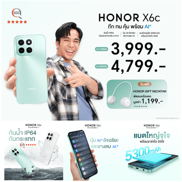 HONOR X6c มีให้เลือกทั้งหมด 2 รุ่น ได้แก่ รุ่น 6+128GB ราคา 3,999 บาท มี 3 สี ได้แก่ Midnight Black, Moonlight White และ Ocean Cyan รุ่น 6+256GB ราคา 4,799 บาท มี 2 สี ได้แก่ Midnight Black และ Ocean Cyan พร้อมโปรโมชั่นพิเศษ เมื่อซื้อ HONOR X6c ระหว่างวันที่ 12 สิงหาคม – 30 กันยายน 2568 รับฟรีทันที HONOR Fan Gift พัดลมคล้องคอ มูลค่า 1,199 บาท ผู้สนใจสามารถดูรายละเอียดเพิ่มเติมหรือสั่งซื้อได้ที่ Lazada : https://s.lazada.co.th/a.c04P6 และ Shopee : https://shopee.co.th/product/969190833/43209552449/ สามารถติดตามข่าวสารและกิจกรรมต่าง ๆ จาก HONOR ได้ทางเฟซบุ๊ก HONOR Thailand หรือร่วมทดสอบความ ถึก ทน คุ้ม พร้อม AI ได้แล้ววันนี้ที่ HONOR Experience Store ทุกสาขาทั่วประเทศ