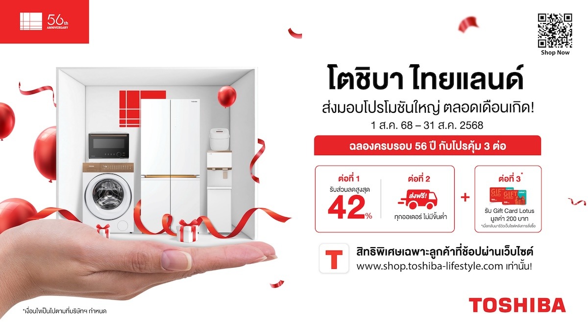 โตชิบา ไทยแลนด์ ขอมอบความขอบคุณอันสุดพิเศษแด่ลูกค้าคนสำคัญทุกท่าน เนื่องในโอกาสครบรอบ 56 ปีของการส่งมอบ “สิ่งที่ดีสู่ชีวิต” ก้าวสู่ปีที่ 57 ด้วยความมุ่งมั่นในการเป็นส่วนหนึ่งในทุกความสุขของครอบ ครัวไทย ด้วยโปรโมชั่นสุดคุ้มค่า 3 ต่อ ตลอดสิงหาคมนี้ ต่อที่ 1 รับส่วนลดสูงสุดถึง 42% สำหรับผลิตภัณฑ์โตชิบาหลากหลายรุ่น ต่อที่ 2 ฟรีค่าจัดส่ง ไม่มียอดขั้นต่ำ ช้อปไหนก็ได้ส่งถึงบ้านฟรี! และต่อที่ 3 เมื่อรีวิวสินค้าหลังการสั่งซื้อ จะได้รับ Lotus Gift Card มูลค่า 200 บาท โปรโมชันพิเศษนี้เฉพาะการสั่งซื้อผ่าน https://shop.toshiba-lifestyle.com/th/ เว็บไซต์ทางการของโตชิบา ไทยแลนด์ เท่านั้น