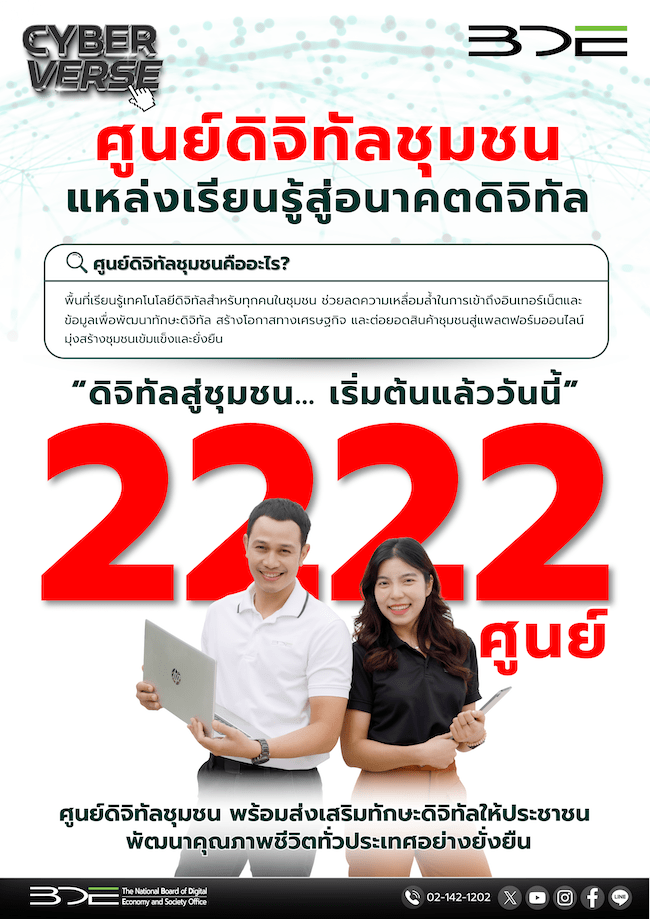 BDE พร้อมเปิดให้บริการศูนย์ดิจิทัลชุมชนแล้ววันนี้ 2,222 ศูนย์ เดินหน้าขับเคลื่อนเศรษฐกิจฐานรากและลดความเหลื่อมล้ำทางดิจิทัล ส่งเสริมทักษะดิจิทัลให้ประชาชน พัฒนาคุณภาพชีวิตทั่วประเทศอย่างยั่งยืน