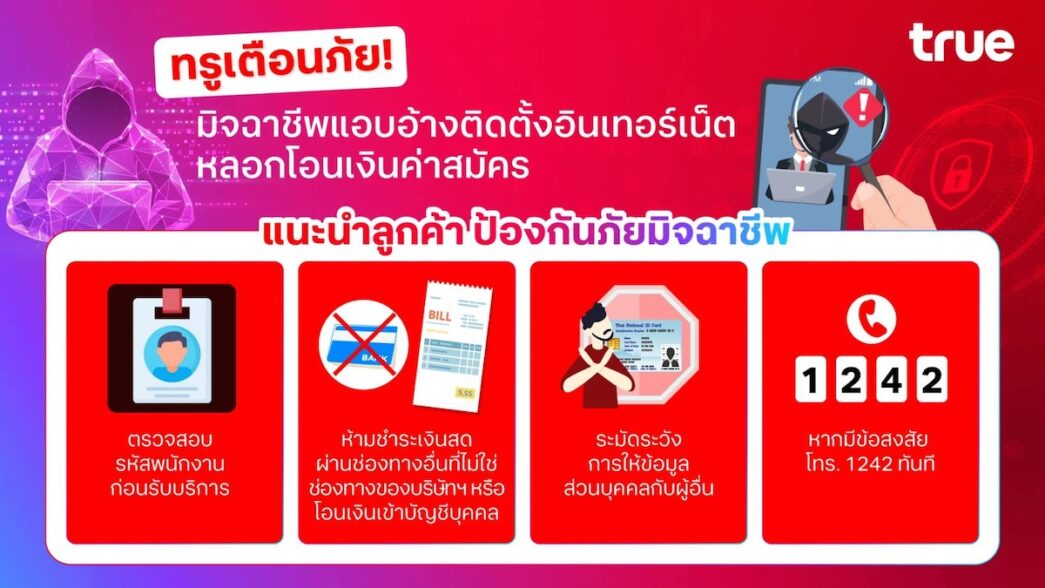 ทรู คอร์ปอเรชั่นขอแจ้งเตือนลูกค้า อย่าหลงเชื่อมิจฉาชีพที่แอบอ้างเป็นพนักงานทรู เสนอโปรโมชั่นติดตั้งอินเทอร์เน็ตราคาถูก พร้อมเรียกเก็บค่าสมัครหรือค่าบริการใดๆ โดยไม่มีใบแจ้งค่าบริการจากทรูและให้โอนเงินเข้าบัญชีบุคคล