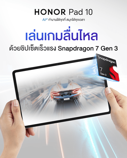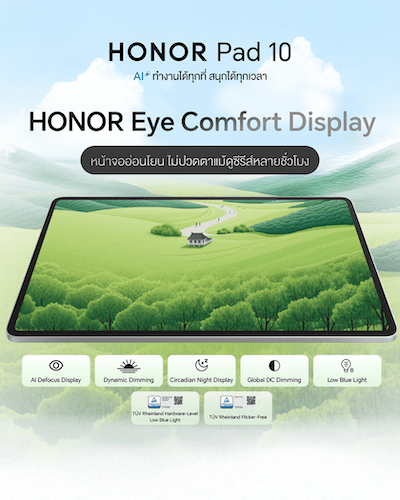 ออเนอร์ (HONOR) เปิดตัว HONOR Pad 10 แท็บเล็ตรุ่นใหม่ล่าสุด ที่ยกระดับประสบการณ์ใช้งานให้ใกล้เคียงกับพีซี ภายใต้คอนเซปต์ “ทำงานได้ทุกที่ สนุกได้ทุกเวลา” ตอบโจทย์ผู้ใช้งานยุคใหม่ที่มองหาแท็บเล็ตครบเครื่อง มาพร้อมปากกาและคีย์บอร์ดในราคาที่คุ้มค่าที่สุดในตลาดไทย โดดเด่นด้วย AI อัจฉริยะที่ช่วยจัดการงานต่างๆ ได้อย่างคล่องตัวทั้งการทำงาน การเรียน และความบันเทิงแบบครบวงจร พร้อมหน้าจอถนอมสายตาขนาดใหญ่ 12.1 นิ้ว ความละเอียด 2.5K เพื่อการรับชมภาพและวิดีโอเต็มอรรถรส ขับเคลื่อนด้วยชิปเซ็ต Snapdragon 7 Gen 3 รองรับ 5G และแบตเตอรี่ทรงพลัง 10,100mAh ในราคาเริ่มต้นเพียง 12,490 บาท