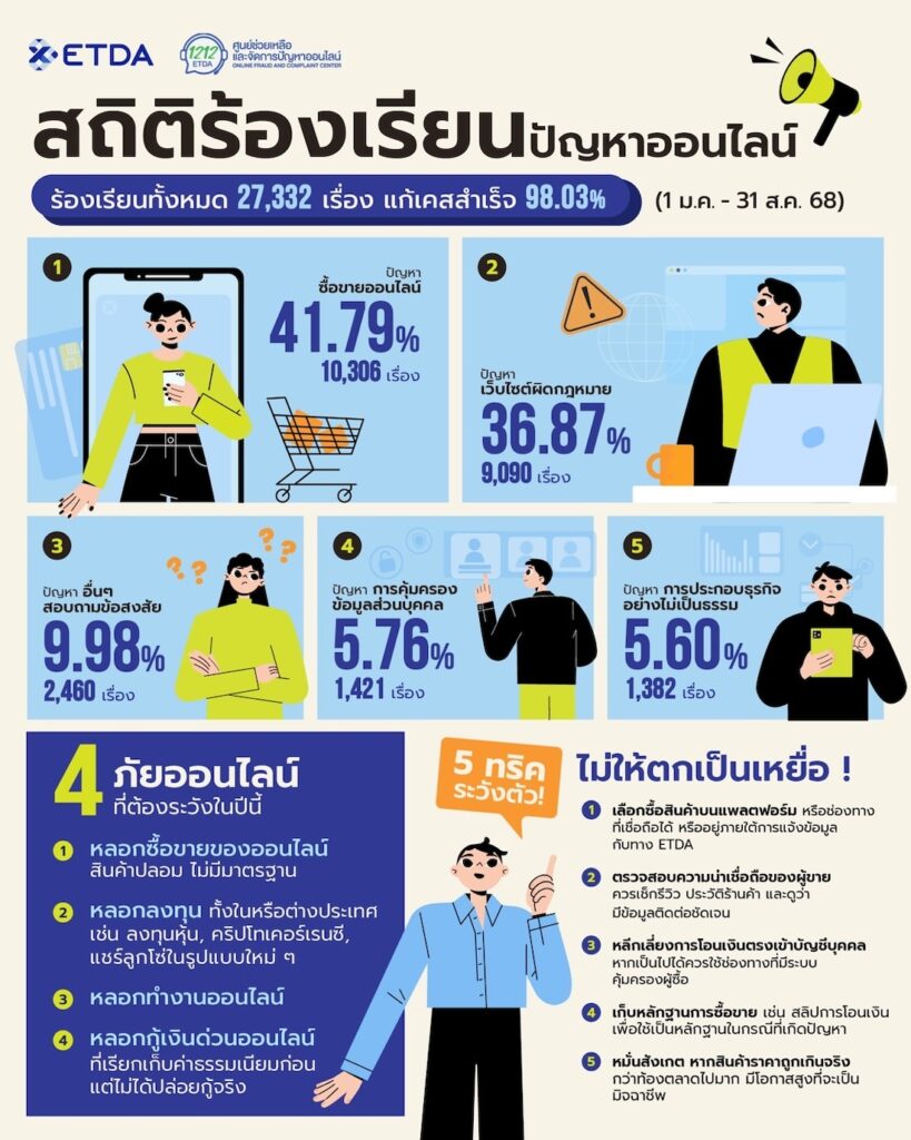 ETDA เผยสถิติร้องเรียนปัญหาออนไลน์ จากศูนย์ช่วยเหลือและจัดการปัญหาออนไลน์ หรือ 1212 ETDA ระหว่างเดือนม.ค.-ส.ค. 68 พบปัญหาร้องเรียนออนไลน์ 27,332 เรื่อง เพิ่มขึ้นจากปี 67 ในช่วงเวลาเดียวกันถึง 4,574 เรื่องหรือ 20.10% โดย ‘ปัญหาซื้อขายออนไลน์-เว็บไซต์ผิดกฎหมาย’ ยังคงครองแชมป์ร้องเรียนมากสุด ขณะที่ กว่า 98.03% หรือ 26,794 เรื่อง ได้รับการช่วยเหลือและแก้ปัญหาแล้ว พร้อมเร่งเครื่องปิดช่องโหว่มิจฉาชีพ ด้วย ‘กลไกร่วมกำกับภายใต้กฎหมาย DPS-สร้างคุ้มกันคนไทยรู้ทันภัยออนไลน์’