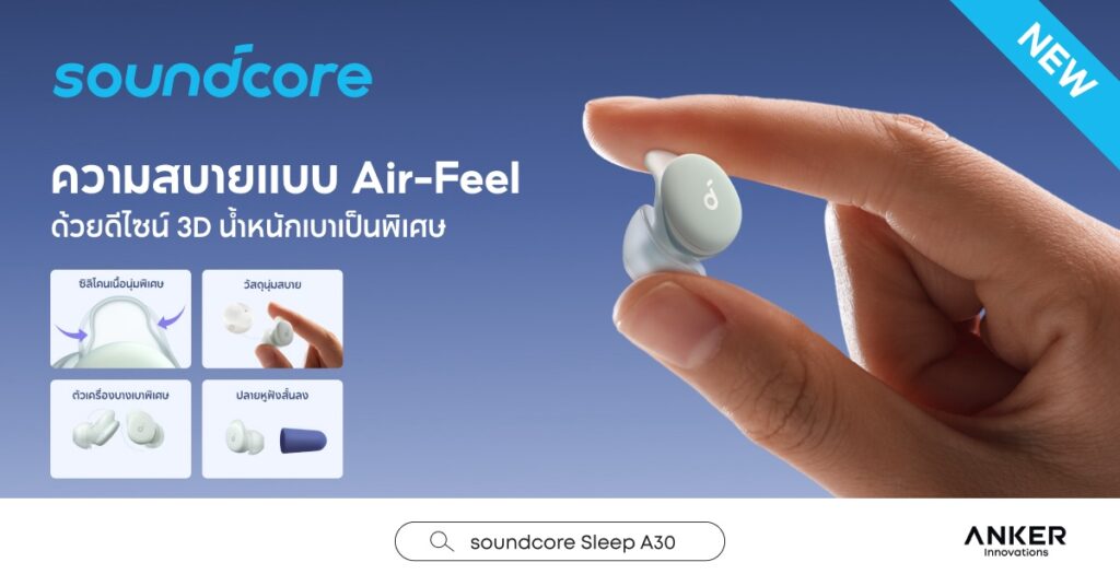 Soundcore แบรนด์เครื่องเสียงระดับพรีเมียมในเครือของแองเคอร์ อินโนเวชั่น (Anker Innovations) ซึ่งครองอันดับสามของโลกในด้านยอดจัดส่งหูฟังไร้สาย เปิดตัว Soundcore Sleep A30 หูฟังสำหรับการนอนหลับรุ่นใหม่ล่าสุดที่ออกแบบมาเป็นพิเศษสำหรับผู้ที่มีปัญหานอนไม่หลับ ผู้ที่ชอบนอนตะแคง และผู้ที่ต้องเผชิญกับสิ่งรบกวนในยามค่ำคืน Soundcore Sleep A30 ผสานเทคโนโลยีตัดเสียงรบกวนแบบแอคทีฟ (ANC) และแบบพาสซีฟ (PNC) เข้ากับเสียงบำบัดจาก AI เพื่อส่งเสริมการพักผ่อนอย่างแท้จริงไม่ว่าจะต้องรับมือกับเสียงกรนของคนข้างๆ เครื่องใช้ไฟฟ้าที่ส่งเสียงรบกวนไม่หยุดหย่อน เสียงรถที่แล่นไปมาในยามดึก หรือสัตว์เลี้ยงที่เคลื่อนไหวไม่เป็นเวลา Soundcore Sleep A30 สามารถมอบความเงียบและความสบายที่จำเป็นต่อการนอนหลับให้เร็วขึ้น หลับได้นานขึ้น และตื่นขึ้นอย่างสดชื่น สะท้อนแนวคิดหลัก “เงียบสงบ หลับสบาย” พร้อมตอกย้ำวิสัยทัศน์ของ Soundcore ในการพลิกโฉมการใช้เทคโนโลยีเพื่อการพักผ่อนที่ดียิ่งขึ้นอย่างต่อเนื่อง