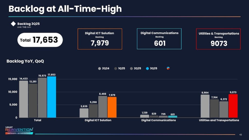 กลุ่มสามารถ มั่นใจผลการดำเนินงานปี 2025 ธุรกิจจะกลับมาพลิกฟื้น ด้วยผลกำไรจากทุกสายธุรกิจในเครือ พร้อมกลับมา Turnaround อย่างเต็มตัว คาดรายได้แตะ 1.1-1.15 หมื่นล้านบาท ผลงานตลอด 9 เดือนมี Backlog ทั้งเครือเกือบ 18,000 ล้านบาท คาดสิ้นปีทะลุ 20,000 ล้านบาทเฉพาะไตรมาสสุดท้ายของปีมีงานรอประมูลอีกเกือบ 9 พันล้านบาท ทั้ง Samtel SAV และ TEDA ที่คาดเป็นพระเอกของกลุ่มในอนาคตมาแรง