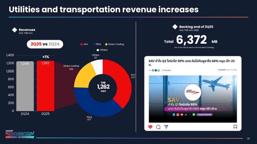 สายธุรกิจ Utilities & Transportations โดยบริษัท สามารถ เอวิเอชั่น โซลูชั่นส์ จำกัด (มหาชน) (SAV) ธุรกิจด้านการให้บริการจัดการการจราจรทางอากาศที่ประเทศกัมพูชา เฉพาะ 9 เดือน จำนวนไฟล์บินเพิ่มขึ้นประมาณ 20% จากปีที่แล้ว ส่วน บริษัท เทด้า จำกัด ที่ดำเนินธุรกิจก่อสร้างโครงการสายส่งสถานีไฟฟ้าแรงสูงแบบครบวงจร ก็ยังสามารถขยายธุรกิจได้อย่างต่อเนื่อง 9 เดือน มี Backlog แล้วกว่า 3,800 ล้านบาทซึ่งคาดว่าจะเป็นพระเอกของกลุ่มในอนาคต ล่าสุดได้งานใหม่รวมมูลค่า 2,400 ล้านบาท อาทิ โครงการสถานีไฟฟ้าแรงสูง 230/115kV ที่นครศรีธรรมราช, ขนอม, พัทลุง, เชียรใหญ่