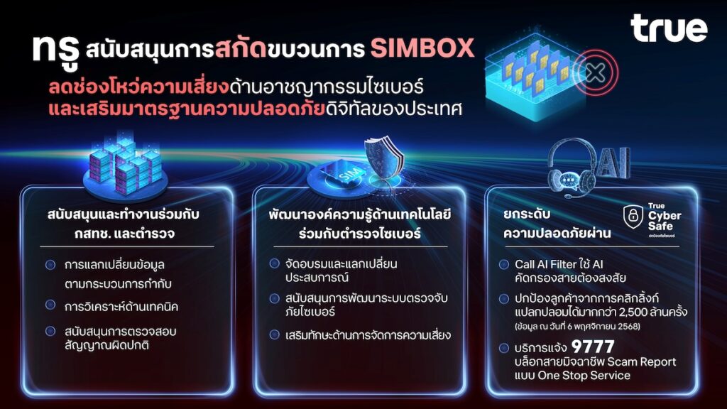 ที่ผ่านมา ทรูมุ่งมั่นสกัดกั้นกลโกงมิจฉาชีพที่ซับซ้อนและเปลี่ยนรูปแบบตลอดเวลา ควบคู่กับการยกระดับความปลอดภัยผ่าน True CyberSafe เกราะป้องกันภัยดิจิทัลสำหรับลูกค้าด้วยบริการ Call AI Filter คัดกรองสายต้องสงสัยด้วย AI และช่วยปกป้องลูกค้าจากการคลิกลิ้งก์แปลกปลอมไปแล้วกว่า 2,531,905,914 ล้านครั้ง (ข้อมูล ณ วันที่ 6 พฤศจิกายน 2568) นอกจากนี้ยังมีบริการแจ้ง 9777 บล็อกสายมิจฉาชีพ Scam Report แบบ One Stop Service ให้ประชาชนแจ้งบล็อกสายต้องสงสัยได้ทันที พร้อมผสานส่งต่อข้อมูลให้เจ้าหน้าที่ตำรวจอย่างรวดเร็ว ความร่วมมือครั้งนี้ ตอกย้ำการทำงานเชิงรุกร่วมกับทุกภาคส่วนแบบไร้รอยต่อปิดทางโทรหลอกลวงและเสริมสร้างความปลอดภัยทางดิจิทัลของประเทศอย่างต่อเนื่อง