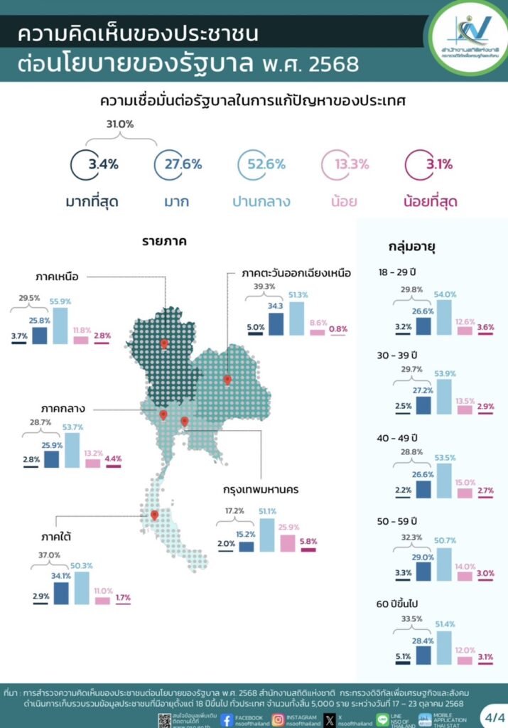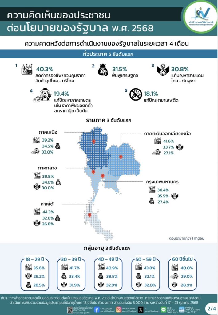 ดร.เอกพงษ์ หริ่มเจริญ ผู้อำนวยการสำนักงานสถิติแห่งชาติ(สสช.) เปิดเผยว่า สำนักงานสถิติแห่งชาติ ดำเนินการสำรวจความคิดเห็นของประชาชนต่อนโยบายของรัฐบาล พ.ศ. 2568 ระหว่างวันที่ 17 – 23 ตุลาคม 2568 โดยการสำรวจครั้งนี้เก็บรวบรวมข้อมูลด้วยวิธีสัมภาษณ์ประชาชนที่มีอายุตั้งแต่ 18 ปีขึ้นไป ซึ่งอาศัยอยู่ในครัวเรือนส่วนบุคคลทั่วประเทศจำนวนทั้งสิ้น 5,000 ราย ใช้แผนการสุ่มตัวอย่างแบบ Stratified Two – stage Sampling เพื่อให้ได้ข้อมูลที่เป็นตัวแทนของประชาชนทุกภูมิภาค