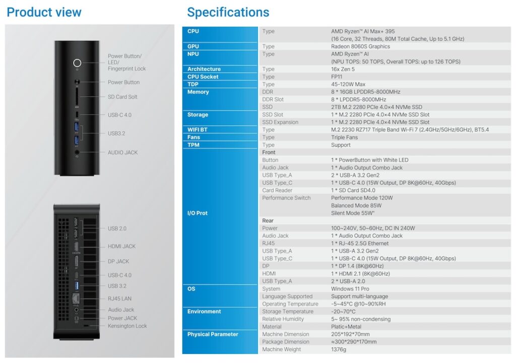 ตัวเครื่องมาพร้อมหน่วยความจำที่รองรับ RAM แบบ LPDDR5 ความเร็ว 8000 MHz ได้สูงสุดถึง 128 GB และพื้นที่จัดเก็บข้อมูลที่สามารถขยายได้ด้วยสล็อต M.2 NVMe แบบคู่ รองรับการจัดเก็บสูงสุดถึง 8 TB — ซึ่งถือเป็นคุณสมบัติระดับสูงที่หาได้ยากในพีซีขนาดเล็ก จึงเหมาะสำหรับผู้ใช้งานที่ต้องการทั้งความยืดหยุ่นและการรองรับในระยะยาว