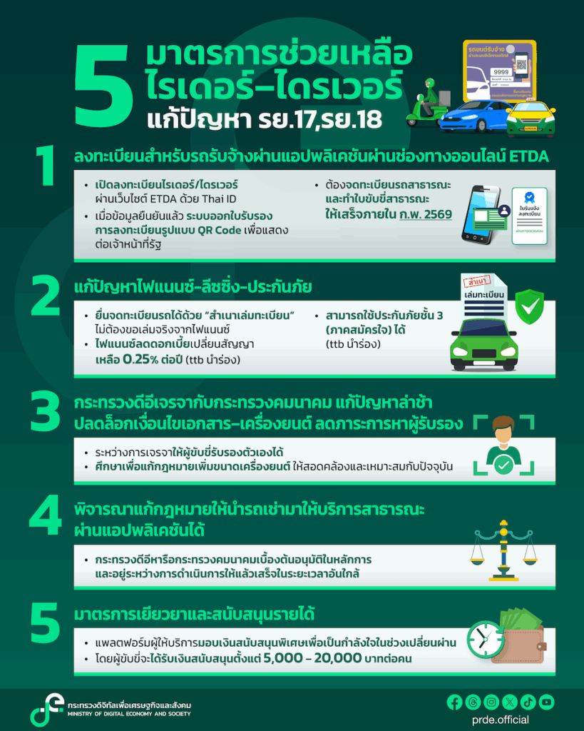 ไชยชนก กล่าวว่า ภายหลังการรับหนังสือร้องเรียนจากไรเดอร์ และไดรเวอร์ เรื่อง “ประกาศเรื่องรถรับจ้างผ่านระบบอิเล็กทรอนิกส์ (รย.17 และ รย.18)” ซึ่งส่งผลกระทบต่อผู้ขับขี่กว่า 200,000 ราย เมื่อวันที่ 11 พฤศจิกายน 2568 ที่ผ่านมา กระทรวงดีอี และกระทรวงคมนาคม โดย ETDA และกรมการขนส่งทางบก(ขบ.) ได้เร่งประสานงาน สถาบันการเงิน และภาคเอกชน เพื่อแก้ไขปัญหาผลกระทบดังกล่าว และกำหนดเป็น 5 มาตรการสำคัญในการช่วยเหลือไรเดอร์และไดรเวอร์ทั่วประเทศ โดยมีกรอบระยะเวลาดำเนินการตั้งแต่วันที่ 17 พฤศจิกายน 2568 – 28 กุมภาพันธ์ 2569 ดังนี้
