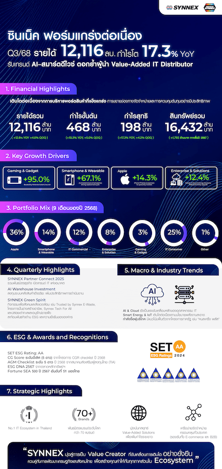 บมจ.ซินเน็ค(ประเทศไทย)หรือ SYNEX โชว์ศักยภาพโตแรง Q3/68 กำไรพุ่ง 17.3% แตะ 198 ล้านบาทกวาดรายได้รวม 12,116 ล้านบาทรับอานิสงส์เทรนด์ AI และ Smart Device ที่ขยายตัวโดดเด่น หนุนกลุ่ม Apple, Smartphone & Wearable โตต่อเนื่อง พร้อมยกระดับความร่วมมือกับ AWS สู่ Advanced Tier Services Partner เสริมพอร์ต Smart Energy Solution และสินค้ามาร์จิ้นสูงตอกย้ำกลยุทธ์ Value-Added IT Distributor ที่มุ่งสร้างคุณค่าให้กับลูกค้าและพันธมิตรทางธุรกิจ เพื่อการเติบโตอย่างยั่งยืน