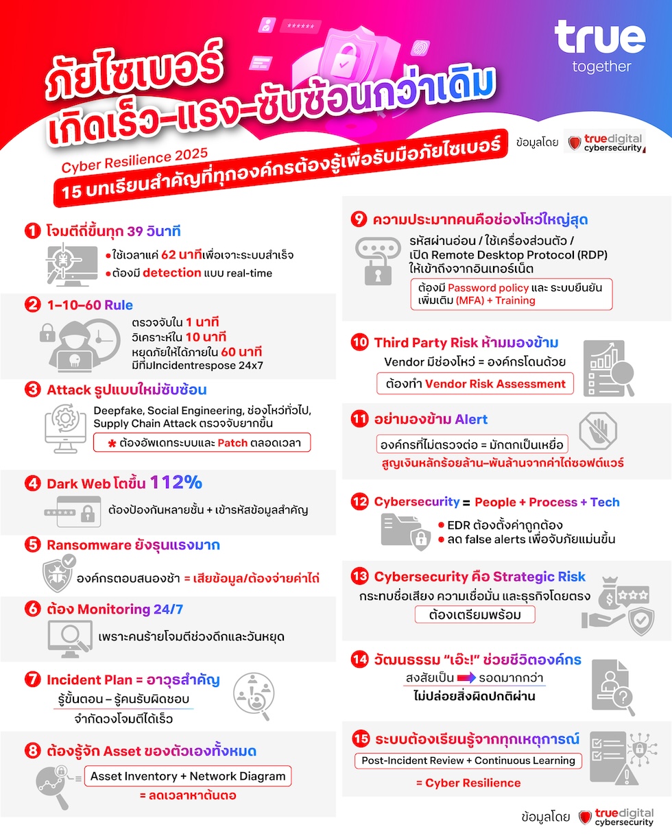 การโจมตีทางไซเบอร์ในปัจจุบันนี้ไม่ใช่เรื่องไกลตัวอีกต่อไป แต่กลายเป็นความเสี่ยงที่เกิดขึ้นได้กับทุกองค์กร ไม่ว่าจะใหญ่หรือเล็ก องค์กรจึงไม่ควรหยุดอยู่แค่การ“ป้องกันไม่ให้ถูกโจมตี” เท่านั้นแต่ต้องเร่งปรับตัวทั้งมุมมอง กระบวนการ และเครื่องมือ เพื่อเตรียมพร้อมรับมือเมื่อเหตุการณ์ไม่คาดคิดเกิดขึ้นจริง แล้วองค์กรจะเริ่มตรงไหนดีและสามารถเรียนรู้อะไรได้บ้างจากเหตุการณ์ที่เคยเกิดขึ้นแล้ว ทรู ดิจิทัล กรุ๊ป โดย ฐิติรัตน์ ศิริพัฒนาเลิศ หัวหน้าสายงานด้านไซเบอร์ ซิเคียวริตี้ ได้แบ่งปันมุมมองที่เป็นประสบการณ์จากเหตุการณ์ภัยไซเบอร์ที่เกิดขึ้นจริงพร้อมสรุปเป็นบทเรียนและแนวทางเสริมสร้าง “ภูมิต้านทานทางไซเบอร์ (Cyber Resilience)” ที่ทุกองค์กรควรนำไปปรับใช้ในการรับมือกับภัยคุกคามในปัจจุบันได้อย่างเป็นรูปธรรม