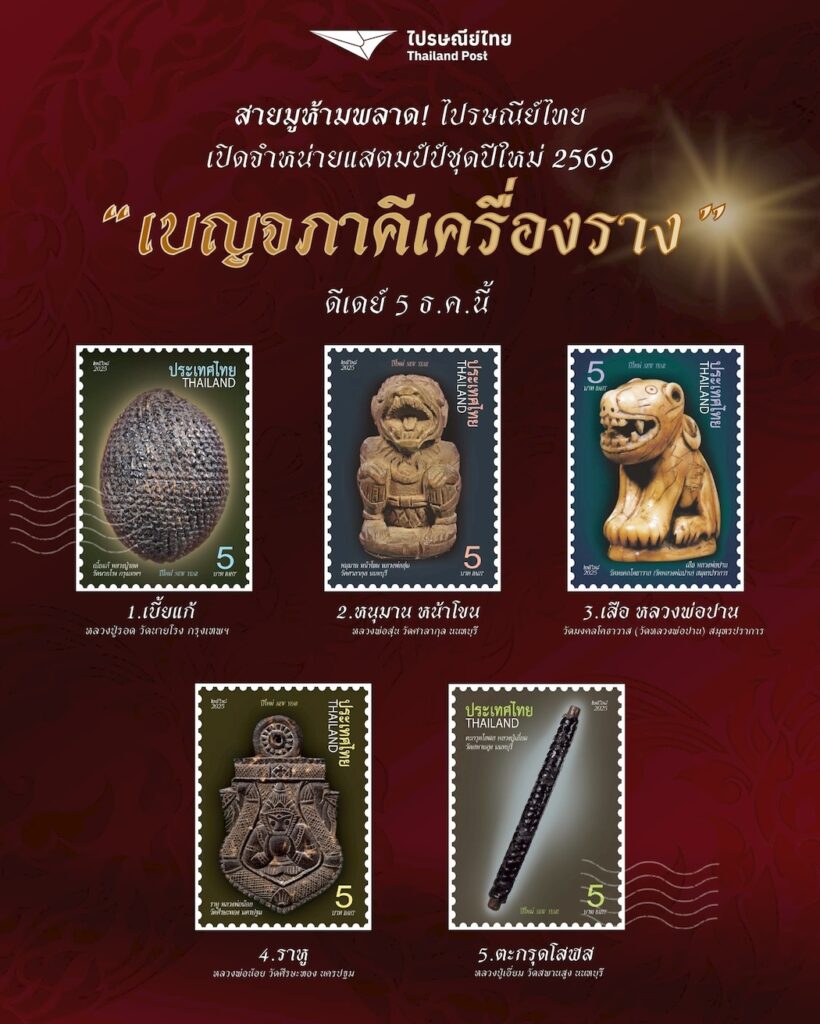 บริษัท ไปรษณีย์ไทย จำกัด ออกตราไปรษณียากรชุดปีใหม่ 2569 “ภาพเบญจภาคีเครื่องราง” เดินหน้ายกระดับแสตมป์ไทยส่งต่อความมงคลที่เข้าถึงได้แห่งศิลปวัฒนธรรมสร้างคุณค่าทางจิตใจและศรัทธาเชิงเศรษฐกิจ ผ่านเบญจภาคีเครื่องราง 5 ของขลังไทยระดับตำนาน ได้แก่ เบี้ยแก้ หนุมาน เสือ ราหูกะลาแกะ และตะกรุดมหาโสฬส โดยแสตมป์จำหน่ายราคาดวงละ 5 บาท เต็มแผ่น 20 ดวง 100 บาท ซองวันแรกจำหน่าย ราคา 61 บาท ผู้สนใจสามารถซื้อได้ที่พิพิธภัณฑ์แสตมป์ไทยสามเสนใน ที่ทำการไปรษณีย์ในกรุงเทพฯ ที่ทำการไปรษณีย์จังหวัด หรือซื้อทางออนไลน์ที่เว็บไซต์ และแอปพลิเคชัน ThailandPostMart ตั้งแต่วันที่ 5 ธันวาคม 2568 เป็นต้นไป