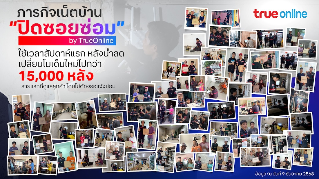 ทรูออนไลน์เดินหน้าภารกิจ “ปิดซอยซ่อม” อย่างต่อเนื่องทันทีตั้งแต่วันแรกที่ระดับน้ำเริ่มลด เพื่อเร่งฟื้นฟูโครงข่ายอินเทอร์เน็ตบ้านของลูกค้าในพื้นที่หาดใหญ่ให้กลับมาใช้งานได้เร็วที่สุด ทีมช่างระดมกำลังจากหลายจังหวัดทั่วประเทศลงพื้นที่เชิงรุก เปลี่ยนโมเด็มใหม่ให้ลูกค้าโดยไม่ต้องรอการแจ้งซ่อม พร้อมตรวจสอบจุดเสียหายทุกพื้นที่ที่ได้รับผลกระทบจากอุทกภัยครั้งนี้ โดยใช้เวลาสัปดาห์แรกหลังน้ำลดเปลี่ยนโมเด็มไปแล้วกว่า 15,000 หลัง เพื่อให้ลูกค้าในพื้นที่ประสบภัยกลับมาดำเนินชีวิตสามารถออนไลน์ได้ตามปกติโดยเร็วและขอแจ้งลูกค้าที่สมัครบริการทรูออนไลน์พร้อมแพ็กเกจประกันภัยบ้านว่า สามารถยื่นเคลมความคุ้มครองสูงสุด 450,000 บาท (คุ้มครองภัยจากน้ำท่วมสูงสุด 100,000 บาท)ได้ที่ทิพยประกันภัย โทร. 1736 กด 0 ตลอด 24 ชั่วโมง