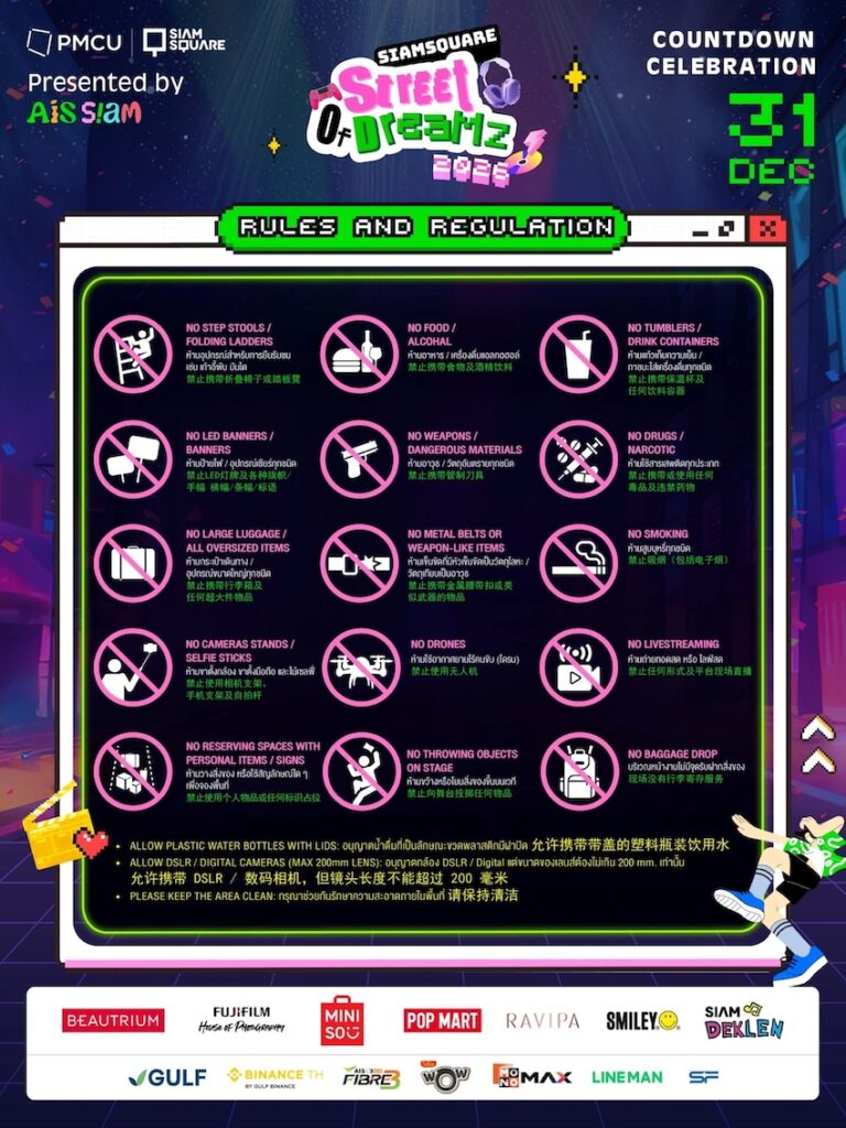 งานนี้เข้าชมฟรี! เปิดพื้นที่ต้อนรับตั้งแต่เวลา 16.30 น. ก่อนปล่อยความสนุกบนเวทีตั้งแต่เวลา 18.00 น. เป็นต้นไป กับไลน์อัปศิลปินและไอดอลขวัญใจคนรุ่นใหม่ที่ทยอยขึ้นมาสร้างบรรยากาศให้คึกคักตลอดคืน