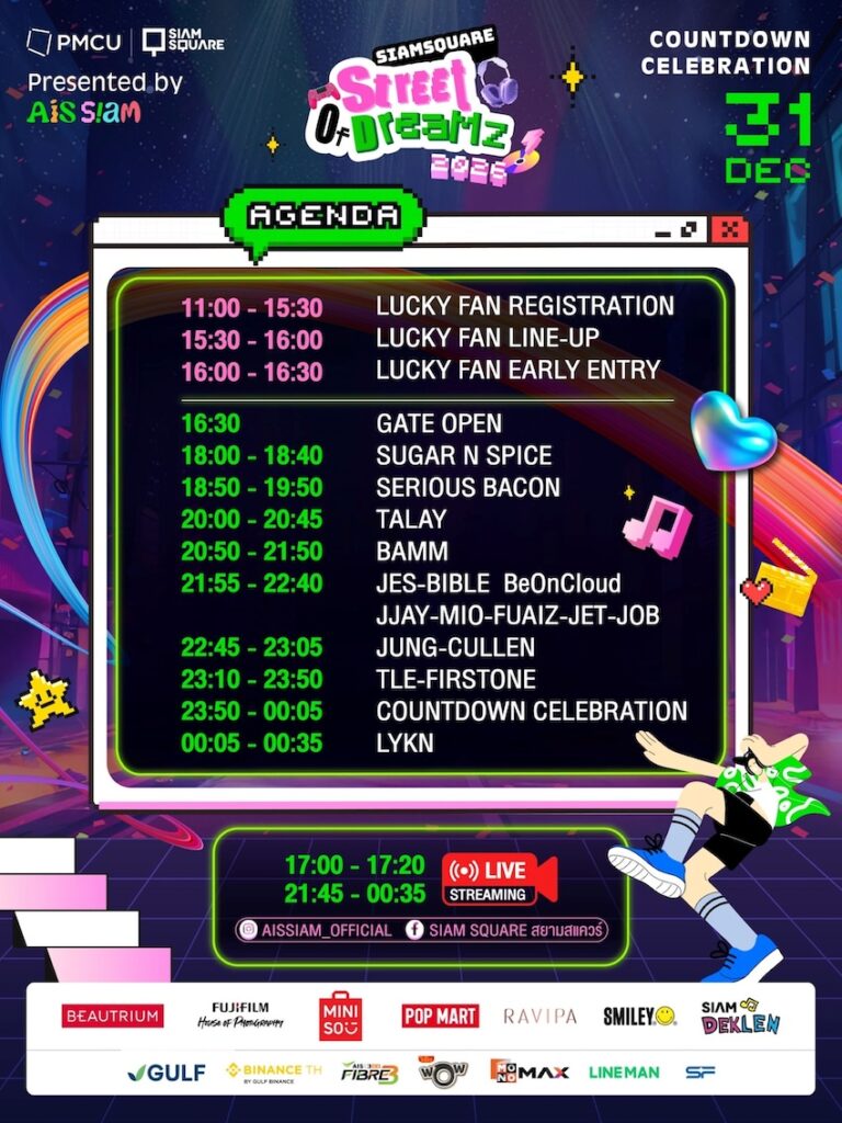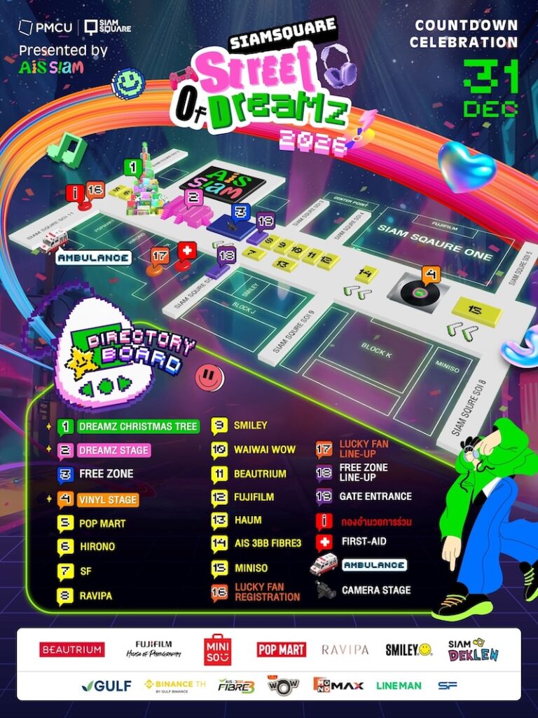 AIS SIAM จับมือ สำนักงานจัดการทรัพย์สิน จุฬาลงกรณ์มหาวิทยาลัย (PMCU) ประกาศความพร้อมชวนคนรุ่นใหม่ออกมาใช้ชีวิตส่งท้ายปีแบบจัดเต็ม ในงานเคานต์ดาวน์สุดมันส์ “SIAM SQUARE STREET OF DREAMZ 2026” วันที่ 31 ธันวาคม 2568 บริเวณหน้า AIS SIAM สยามสแควร์ เนรมิตพื้นที่ใจกลางเมืองให้กลายเป็นถนนแห่งความฝัน ที่เต็มไปด้วยเสียงเพลง แสงไฟ และพลังของคนมีแพสชัน พร้อมพาทุกคนก้าวเข้าสู่ปีใหม่ 2026 ไปด้วยกัน