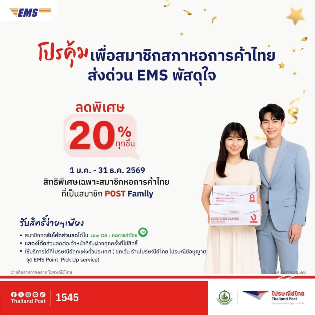 นอกจากนี้ ไปรษณีย์ไทยยังตอกย้ำบทบาทในฐานะพันธมิตรด้านโลจิสติกส์ ที่ช่วยขับเคลื่อนการค้าและธุรกิจไทยในทุกระดับผ่านโปรคุ้มเพื่อสมาชิกสภาหอการค้าไทยส่งด่วน EMS พัสดุใจ มอบส่วนลดพิเศษ 20% ทุกชิ้นตลอดทั้งปี ตั้งแต่วันนี้ จนถึงวันที่ 31 ธันวาคม 2569 สำหรับสมาชิกหอการค้าไทยที่เป็นสมาชิก POST Family เพื่อเสริมศักยภาพผู้ประกอบการ SMEs และภาคธุรกิจในการจัดส่งสินค้าอย่างมีประสิทธิภาพ เพียงกดรับโค้ดส่วนลดผ่าน Line OA : หอการค้าไทย และแสดงโค้ดส่วนลดต่อเจ้าหน้าที่รับฝากทุกครั้งที่ใช้สิทธิ์