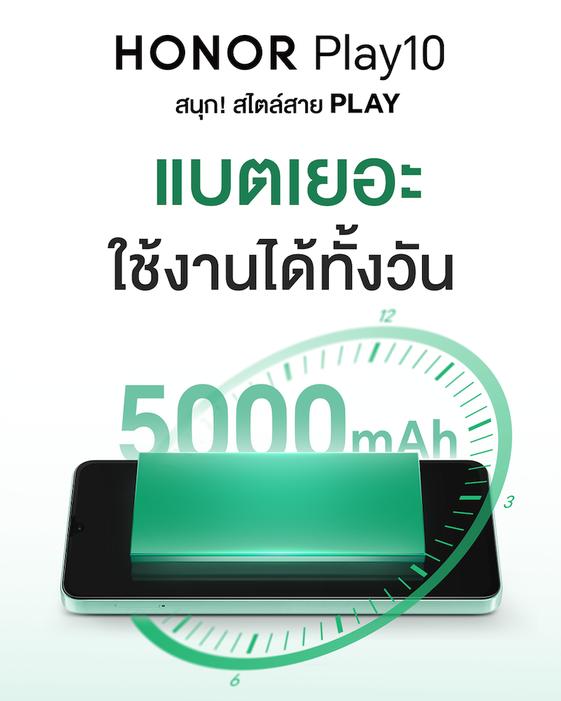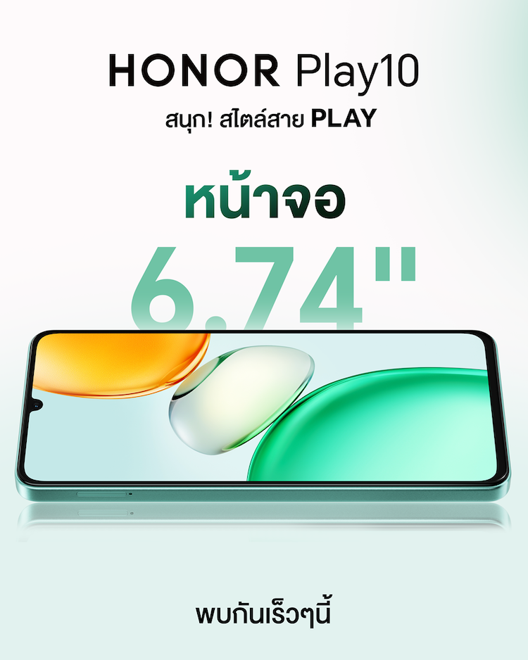 นอกจากนี้ HONOR ยังเตรียมเปิดตัวสมาร์ทโฟนอีกรุ่นที่น่าจับตามองอย่าง HONOR Play 10 มาพร้อมคอนเซ็ปต์ ‘สนุก สไตล์สายเพล์’ ซึ่งออกแบบมาเพื่อตอบโจทย์ผู้ใช้งานที่มองหาความคุ้มค่าและประสิทธิภาพการใช้งานในชีวิตประจำวัน โดดเด่นด้วยแบตเตอรี่ขนาดใหญ่ 5,000mAh ชาร์จไว 10W พร้อมหน้าจอขนาดใหญ่ 6.74 นิ้วให้ภาพคมชัดและลื่นไหลด้วย อัตรารีเฟรช 90Hz เพิ่มอรรถรสทั้งการรับชมคอนเทนต์และการใช้งานทั่วไป ด้านประสิทธิภาพ HONOR Play 10 มาพร้อมชิปเซ็ต MediaTek Helio G81 แบบ Octa-core ช่วยให้การประมวลผลเป็นไปอย่างรวดเร็วและเสถียร รองรับการใช้งานหลากหลายรูปแบบ ทั้งการสื่อสาร ความบันเทิง และการใช้งานในชีวิตประจำวันได้อย่างลงตัว