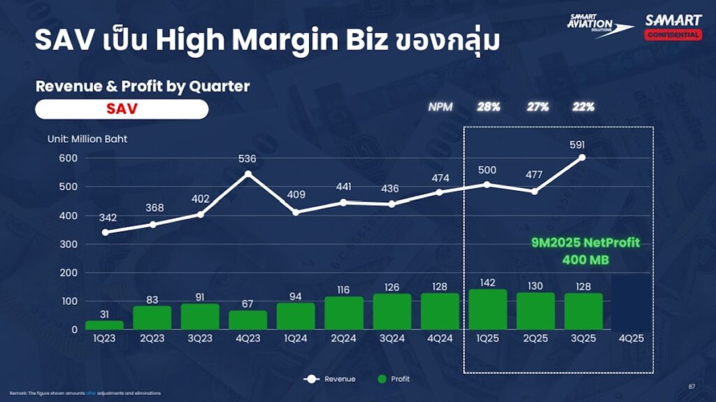 นอกจากนี้ SAV ยังมุ่งพัฒนาและปรับปรุงระบบด้านการบิน ซึ่งช่วยเสริมความมั่นคงและการกระจายที่มาของรายได้ เพื่อลดความเสี่ยงจากการพึ่งพารายได้เพียงช่องทางเดียวจากสัญญาวิทยุการบินในกัมพูชา พร้อมปรับตัวสู่การเป็นผู้จัดหาอุปกรณ์สนามบิน (Airport Solutions) เช่น ระบบ FOD ตรวจหาวัตถุแปลกปลอมบนรันเวย์