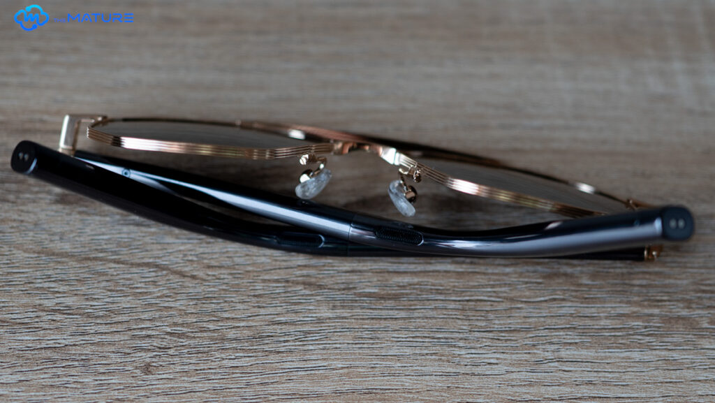 ตัวขาแว่นมากับเซ็นเซอร์ตรวจจับการสวมใส่ ถ้าถอดแว่น เพลงหยุด ใส่กลับเข้าไป เพลงเล่นต่อทันที ช่วยประหยัดแบตเตอรี่ ที่สามารถใช้งานได้ต่อเนื่อง 10-13 ชั่วโมง คุยโทรศัพท์ได้ต่อเนื่อง 7-9 ชั่วโมง สแตนบายได้ 12 วัน ถ้าใครใช้เป็นแว่นสายตา ก็ใช้เวลาช่วงที่นอนหลับ 1 ชั่วโมงในการชาร์จแบตฯ