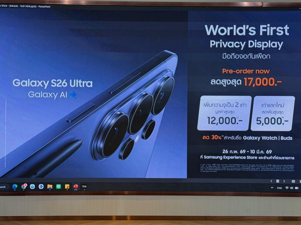 มาในปีนี้ Samsung ประเดิมการเปิดตัวแฟลกชิป Galaxy S26 Ultra ด้วยการนำเสนอนวัตกรรมจอแสดงผลให้แก่ตลาดสมาร์ทโฟนเป็นครั้งแรก ด้วยการนำหน้าจอ Privacy Display เข้ามาใช้งาน เปิดทางให้ผู้ใช้สามารถเลือกเปิดโหมดป้องกันคนแอบดูหน้าจอได้ในช่วงเวลาที่ต้องการ หรือจะเลือกเปิดเฉพาะแอปฯ การแจ้งเตือน หรือเมื่อป้อนรหัสผ่านก็ได้