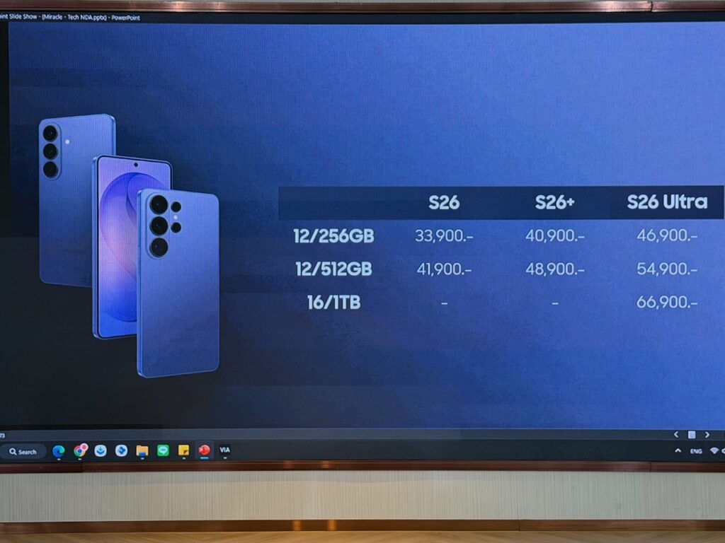 ขณะที่ Samsung Galaxy S26+ รุ่น 256GB ราคา 40,900 บาท และรุ่น 512GB ราคา 48,900 บาท ส่วน Samsung Galaxy S26 รุ่น 256GB ราคา 33,900 บาท และรุ่น 512GB ราคา 41,900 บาท