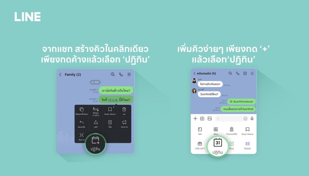 หนึ่งในพฤติกรรมที่ผู้ใช้จำนวนมากคุ้นเคย คือ การนัดหมายกันยาวในแชท แต่สุดท้ายลืมบันทึกลงปฏิทิน หรือมีตารางกระจัดกระจายอยู่หลายแอป LINE จึงพัฒนาฟีเจอร์ ‘ปฏิทิน’ บน LINE เพื่อให้ทุกการนัดหมาย “ครบจบในที่เดียว” ได้ ไม่ว่าจะเป็นการนัดเพื่อนหรือเรื่องสำคัญ สามารถสร้างได้ง่ายๆ บน LINE โดยไม่ต้องสลับไปใช้งานแพลตฟอร์มอื่น