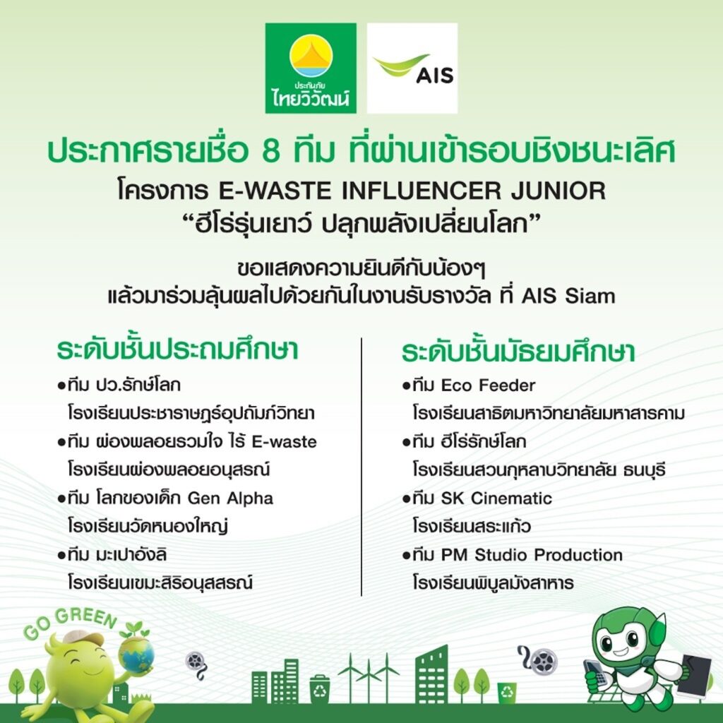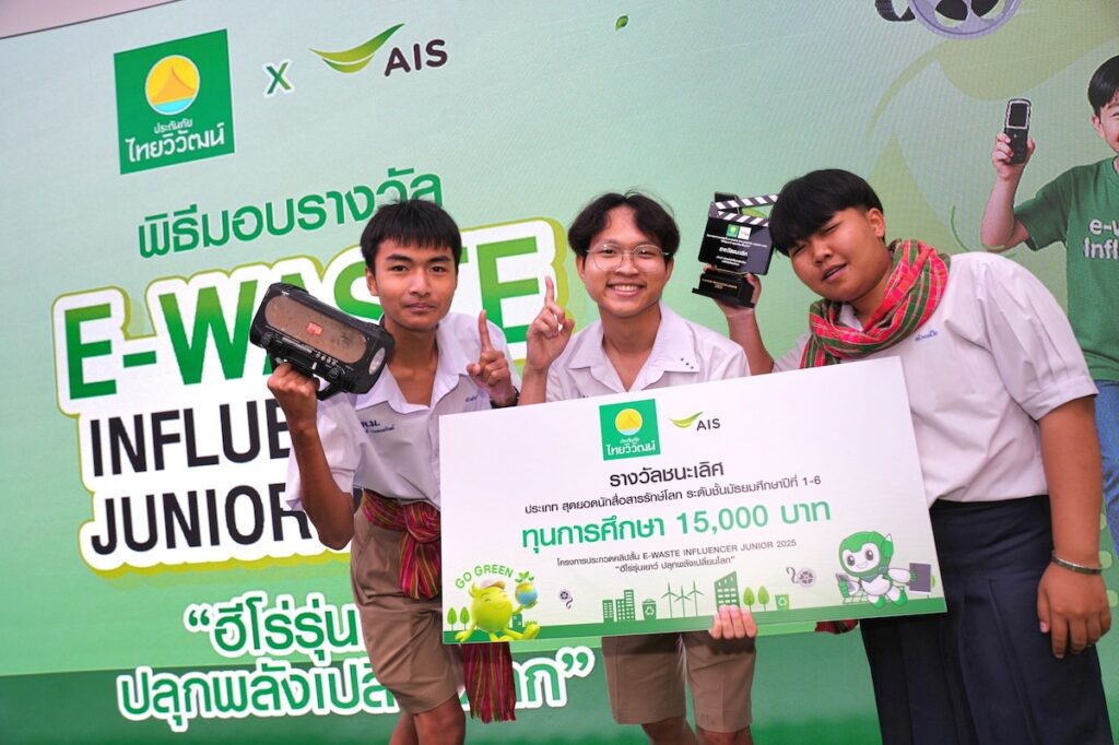 AIS ร่วมกับ บริษัท ประกันภัยไทยวิวัฒน์ จำกัด (มหาชน) ตอกย้ำความร่วมมือในการขับเคลื่อนการจัดการขยะอิเล็กทรอนิกส์ (E-Waste) อย่างยั่งยืน ผ่านโครงการ “E-Waste Influencer Junior ฮีโร่รุ่นเยาว์ ปลุกพลังเปลี่ยนโลก” เวทีประกวดคลิปวิดีโอสั้นที่เปิดพื้นที่ให้เยาวชนไทยได้แสดงศักยภาพในฐานะนักสื่อสารสิ่งแวดล้อมรุ่นใหม่ ใช้พลังโซเชียลมีเดียเป็นเครื่องมือสร้างการเปลี่ยนแปลงเชิงบวกแก่สังคม มุ่งส่งเสริมให้เด็กและเยาวชนตระหนักถึงปัญหา E-Waste เรียนรู้แนวทางการจัดการอย่างถูกต้อง และร่วมเป็นส่วนหนึ่งในการสร้างเครือข่ายโรงเรียนต้นแบบด้านสิ่งแวดล้อมในอนาคต โดยได้รับการตอบรับเป็นอย่างดี มีผู้ส่งผลงานเข้าร่วมประกวดรวมทั้งสิ้น 295 คลิป แบ่งเป็นระดับประถมศึกษา 27 คลิป และระดับมัธยมศึกษา 268 คลิป สะท้อนถึงพลังการมีส่วนร่วมของเยาวชนไทยทั่วประเทศ