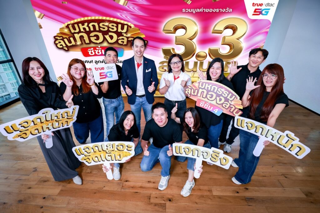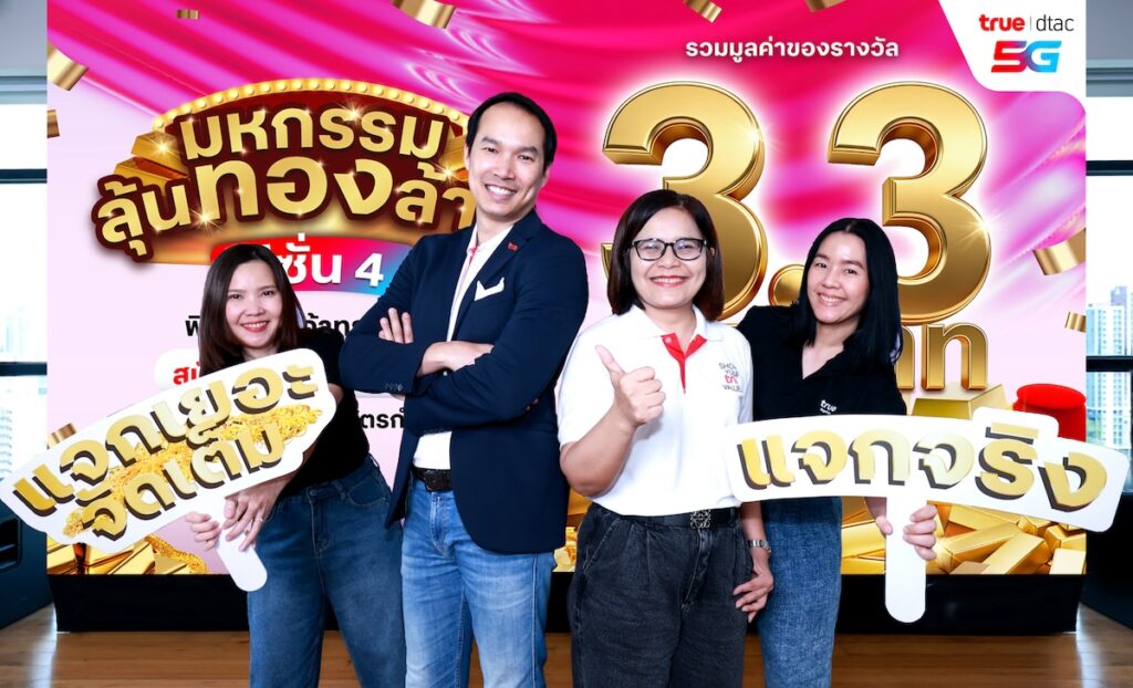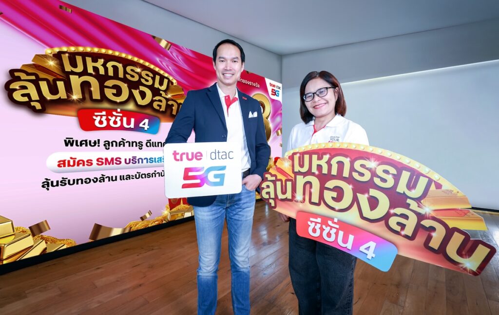 ส่งต่อความเฮงแบบฉุดไม่อยู่! ทรู5G โดยภูริโชติ วงศ์โกมลเชษฐ์หัวหน้าฝ่ายบริการดิจิทัลและสุนิษา อนันทนุพงศ์ หัวหน้ากลุ่มงานโมบายล์คอนเทนต์ บมจ.ทรู คอร์ปอเรชั่น จับมือ 6 พันธมิตรผู้ให้บริการคอนเทนต์ชั้นนำ เปิดตัวแคมเปญใหญ่แห่งปี “มหกรรมลุ้นทองล้าน ซีซั่น 4” ขนรางวัลทองคำมูลค่าหลักล้านและบัตรของขวัญรวมมูลค่ามหาศาลมาแจกลูกค้าแบบจัดเต็ม ตอกย้ำความมุ่งมั่นในการส่งมอบความสุขและสิทธิพิเศษที่เหนือกว่า ตอบโจทย์ไลฟ์สไตล์ลูกค้าสายมูและคนชอบลุ้นทั่วประเทศ แจกจริง 30 รางวัลใหญ่ รวมมูลค่ากว่า 3.3 ล้านบาท