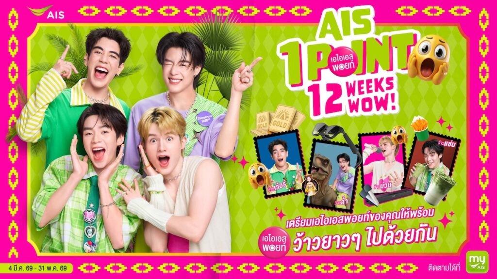 ด้วยไฮไลต์แคมเปญสุดว้าว “12 Weeks 12 WOW!” ภายใต้แนวคิด “อุ่นใจทุกเส้นทาง” ที่ให้ลูกค้าใช้ AIS Point เพียง 1 คะแนน แลกรับสิทธิประโยชน์ต่างๆ ผ่านแอป myAIS ดังนี้