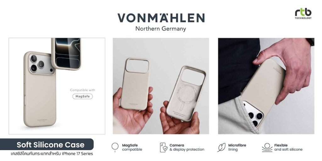 -VONMÄHLEN Soft Silicone Case เคสซิลิโคนสำหรับ iPhone 17 Series ที่โดดเด่นด้วยดีไซน์บางเฉียบ น้ำหนักเบา และแนบสนิทไปกับตัวเครื่อง มอบทั้งความสวยงามและการปกป้องรอบด้าน ผลิตจากวัสดุรีไซเคิลที่ได้รับการรับรองมาตรฐาน GRS (Global Recycle Standard Certified) สูงสุดถึง 69% เพื่อช่วยลดผลกระทบด้านสิ่งแวดล้อม ด้านนอกผลิตจากซิลิโคนที่ผสานเทคโนโลยี Ever-Soft ให้ผิวสัมผัสที่เนียนนุ่มเป็นพิเศษ ขณะที่ด้านในบุด้วยไมโครไฟเบอร์เนื้อนุ่ม ช่วยป้องกันรอยขีดข่วนและดูดซับแรงกระแทก โครงสร้างแบบปิดด้านล่างช่วยเพิ่มการปกป้องมากยิ่งขึ้น พร้อมช่องพอร์ตที่ออกแบบอย่างแม่นยำเพื่อการใช้งานที่สะดวก ปุ่มกดซิลิโคนตอบสนองไว รองรับการชาร์จแบบแม่เหล็กไร้สาย (MagSafe) พร้อมขอบรอบหน้าจอและเลนส์กล้องยกสูง เพื่อป้องกันแรงกระแทกและรอยขีดข่วน รองรับ iPhone 17, iPhone 17 Air, iPhone 17 Pro และ iPhone 17 Pro Max มีให้เลือกหลายสี ได้แก่ Black, Navy, Light Gray, Cream, Dark Cream และ Dark Red วางจำหน่ายในราคา 990 บาท