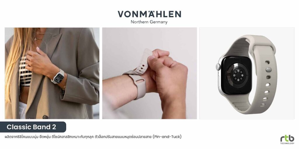 -VONMÄHLEN Classic Band 2 สายสำหรับ Apple Watch ดีไซน์คลาสสิกที่ผสานความเรียบหรูและฟังก์ชันการใช้งานอย่างลงตัว ผลิตจากซิลิโคนรีไซเคิลคุณภาพสูง ผิวเรียบนุ่ม ยืดหยุ่น และไม่ระคายเคืองผิว มาพร้อมช่องระบายอากาศด้านใน ช่วยให้อากาศไหลเวียนได้ดียิ่งขึ้น ลดความร้อนและเหงื่อสะสม ทำให้ข้อมือแห้งสบายตลอดทั้งวัน เหมาะสำหรับการใช้งานในชีวิตประจำวันและไลฟ์สไตล์สายแอคทีฟ ตัวล็อกแบบหมุดซ่อนปลายสาย (Pin-and-Tuck) ช่วยให้สวมใส่ได้กระชับและปรับขนาดได้ง่าย รองรับ Apple Watch ขนาด 40/41/42mm และ 44/45/46/49mm มีให้เลือก 3 สี ได้แก่ Black, Navy และ Cream วางจำหน่ายในราคา 890 บาท