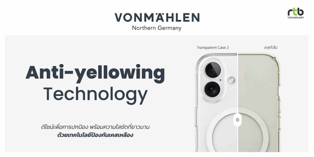 -VONMÄHLEN Transparent Case 2 เคสใสกันกระแทกสำหรับ iPhone 17 Series ที่ผสานดีไซน์บางเฉียบเข้ากับการปกป้องอย่างเต็มประสิทธิภาพ พร้อมโชว์ความสวยงามของตัวเครื่องได้อย่างชัดเจน ผลิตจากวัสดุ TPU และ PC ที่ผ่านการรับรองมาตรฐาน GRS (Global Recycle Standard Certified) ช่วยลดผลกระทบด้านสิ่งแวดล้อม พร้อมเคลือบสาร Anti-Yellowing ช่วยป้องกันเคสเหลืองและคงความใสได้ยาวนาน มาพร้อมปุ่มกดเมทัลลิกที่ตอบสนองไว ใช้งานได้อย่างลื่นไหล รองรับการชาร์จแบบแม่เหล็กไร้สาย (MagSafe) ด้วยแม่เหล็กแรงดูดแน่นในตัว ขอบรอบหน้าจอและเลนส์กล้องยกสูง เพิ่มการปกป้องจากแรงกระแทกและรอยขีดข่วน รองรับ iPhone 17, iPhone 17 Air, iPhone 17 Pro และ iPhone 17 Pro Max วางจำหน่ายในราคา 1,190 บาท