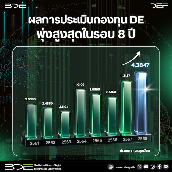 เวทางค์ พ่วงทรัพย์ เลขาธิการคณะกรรมการดิจิทัลเพื่อเศรษฐกิจและสังคมแห่งชาติ (BDE) เผยผลการประเมินผลการดำเนินงานทุนหมุนเวียน ประจำปีบัญชี 2568 โดยกรมบัญชีกลาง พบว่า สำนักงานคณะกรรมการดิจิทัลเพื่อเศรษฐกิจและสังคมแห่งชาติ (BDE) โดยกองทุนพัฒนาดิจิทัลเพื่อเศรษฐกิจและสังคมหรือกองทุนดีอีประกาศผลการประเมินการดำเนินงานทุนหมุนเวียน ประจำปีบัญชี 2568 สามารถทำคะแนนได้สูงถึง 4.3847 คะแนนซึ่งเป็นสถิติที่สูงที่สุดนับตั้งแต่เริ่มรับการประเมินในปี2561เป็นต้นมา